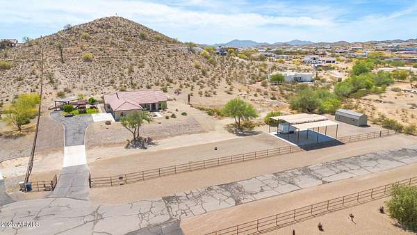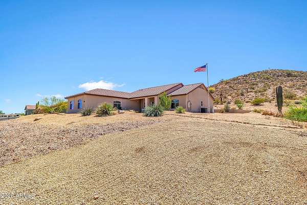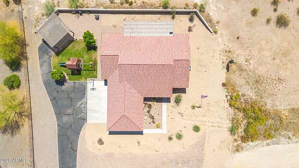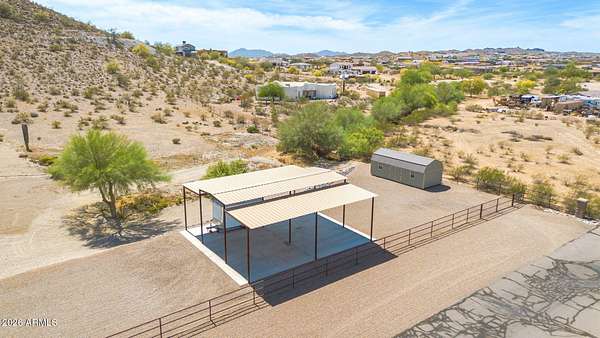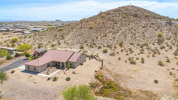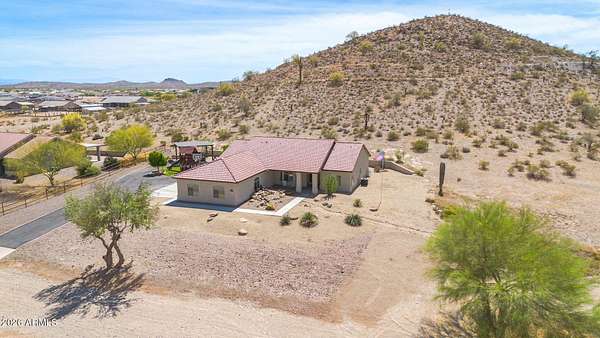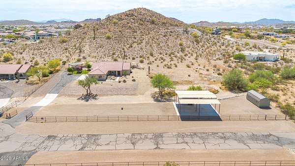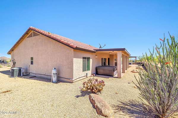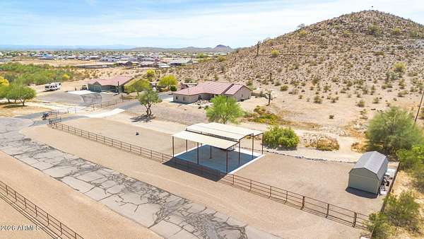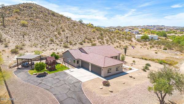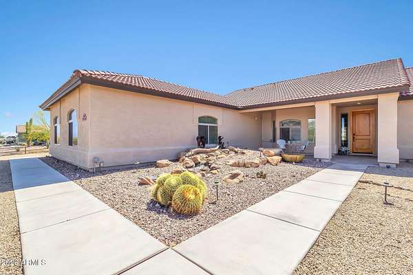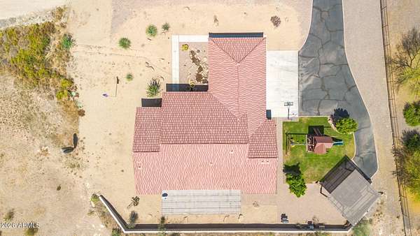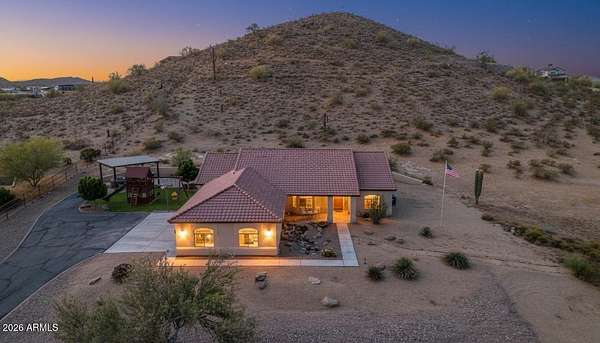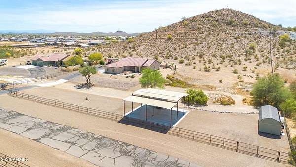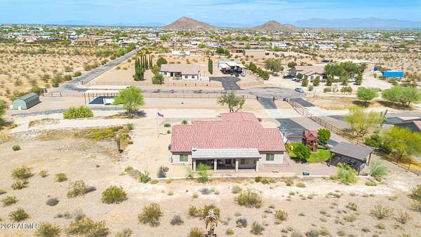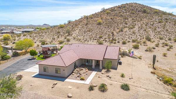 {3.43 ACRES | NO HOA | 4 CAR EXTENDED GARAGE | FULLY FENCED w/ PRIVATE GATED ENTRY} Come see this beautifully maintained property in San Tan Valley offering space, privacy, horse privileges, and stunning mountain and desert views. The home backs to the mountain, providing added seclusion and a peaceful setting. The expansive outdoor setup features a designer water feature at the front entry, an extended covered patio with above-ground spa, pergola seating area, grassy play space & playground, storage shed, and a 3-bay RV shade with poured concrete slab and drive-through access--perfect for all your toys. Inside, the open 4 bedroom, 2 bath split floorplan offers fresh interior paint, vaulted ceilings, plush carpet, and a gorgeous gas fireplace in the family room. See MORE Remarks... The kitchen includes granite countertops, SS appliances, and upgraded cabinetry. The primary suite features double-door entry, 5-piece en-suite bath w/ soaking tub, and a walk-in closet. One secondary bedroom w/ double doors is ideal for a home office or flex space. The extended 4-car garage includes built-in cabinetry, offering generous storage and workspace, with approximate dimensions of 24x40 ft (960 sq ft) and oversized 16x8 ft garage doors. In addition, the 12x28 ft outdoor storage shed has two upper storage areas, providing approximately 612 sq ft of versatile extra storage. This is a rare opportunity to own acreage with privacy, views, and room to live, play, and grow--all in one.