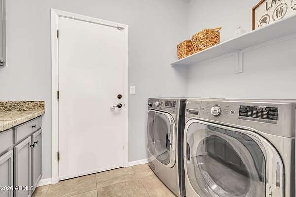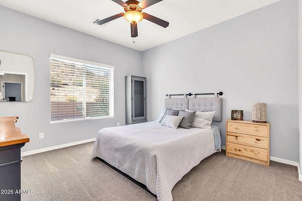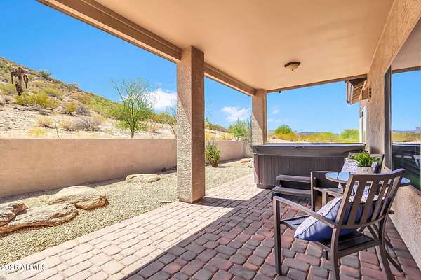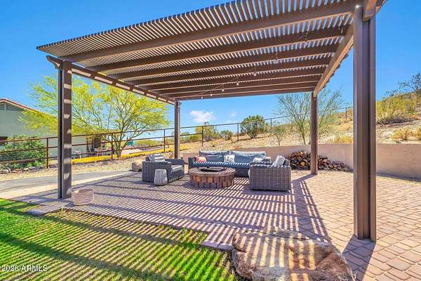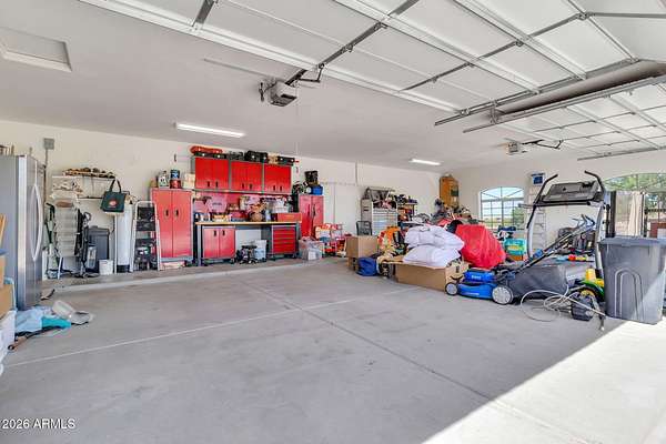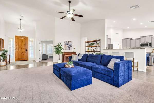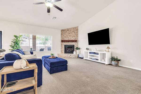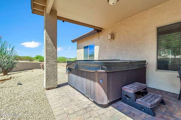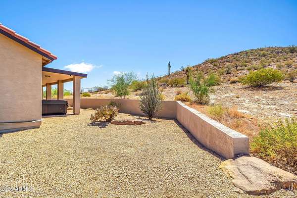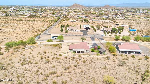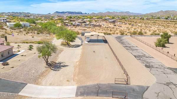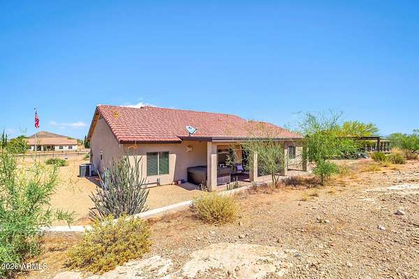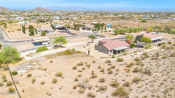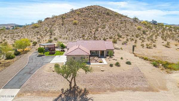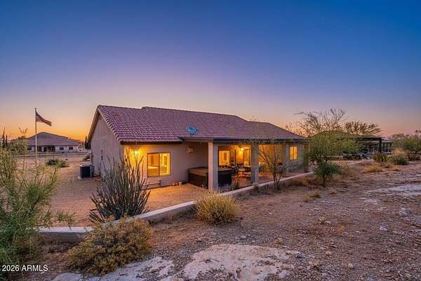 {3.43 ACRES | NO HOA | 4 CAR EXTENDED GARAGE | FULLY FENCED w/ PRIVATE GATED ENTRY} Come see this beautifully maintained property in San Tan Valley offering space, privacy, horse privileges, and stunning mountain and desert views. The home backs to the mountain, providing added seclusion and a peaceful setting. The expansive outdoor setup features a designer water feature at the front entry, an extended covered patio with above-ground spa, pergola seating area, grassy play space & playground, storage shed, and a 3-bay RV shade with poured concrete slab and drive-through access--perfect for all your toys. Inside, the open 4 bedroom, 2 bath split floorplan offers fresh interior paint, vaulted ceilings, plush carpet, and a gorgeous gas fireplace in the family room. See MORE Remarks... The kitchen includes granite countertops, SS appliances, and upgraded cabinetry. The primary suite features double-door entry, 5-piece en-suite bath w/ soaking tub, and a walk-in closet. One secondary bedroom w/ double doors is ideal for a home office or flex space. The extended 4-car garage includes built-in cabinetry, offering generous storage and workspace, with approximate dimensions of 24x40 ft (960 sq ft) and oversized 16x8 ft garage doors. In addition, the 12x28 ft outdoor storage shed has two upper storage areas, providing approximately 612 sq ft of versatile extra storage. This is a rare opportunity to own acreage with privacy, views, and room to live, play, and grow--all in one.