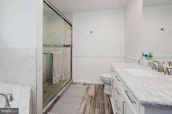 - Combination Dining/Living, Entry Level Bedroom, Jetted Tub Bathroom, Open Floor Plan, Primary Bath(s), Stall Shower Bathroom, Walk-In Closet(s), Wood Floors