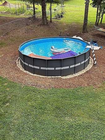 - Second-story deck overlooking the lake with wall-mounted outdoor television- Front porch with a daybed porch swing- Concrete patio off the walkout basement- Above-ground pool- Fenced backyard- Covered carport and storage area