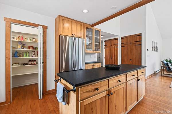 Recent updates add both comfort and style, including soapstone kitchen countertops, new appliances, fresh interior paint, a remodeled laundry room, a cozy pellet stove, and a dry sauna—perfect for relaxing after a day spent enjoying the outdoors. The kitchen also features hickory cabinetry and a generous pantry, blending warmth with practicality.
