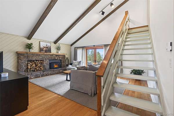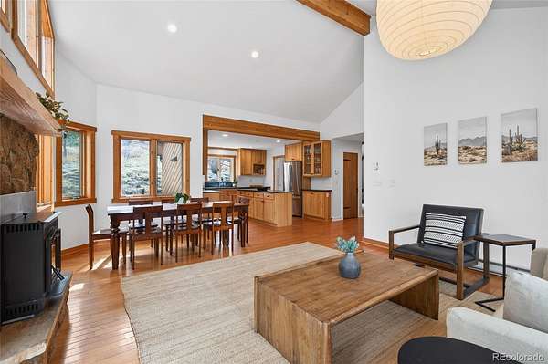 The main living spaces are open and inviting with vaulted ceilings, oak hardwood floors, and restored solid wood grooved doors. Step outside to the expansive deck, ideal for entertaining, dining, or simply taking in the surrounding mountain views.
