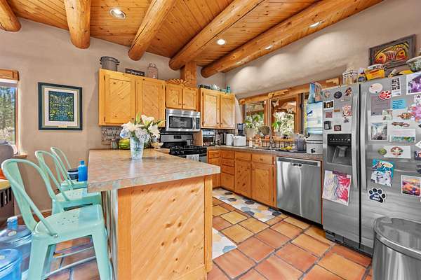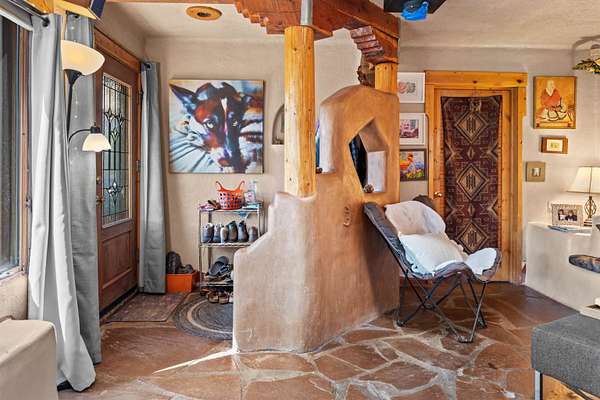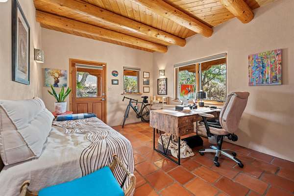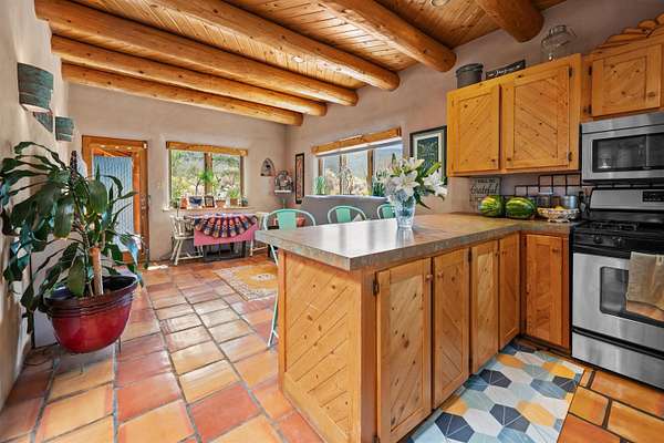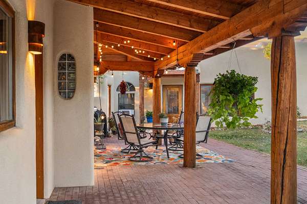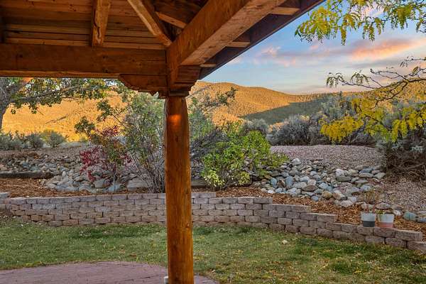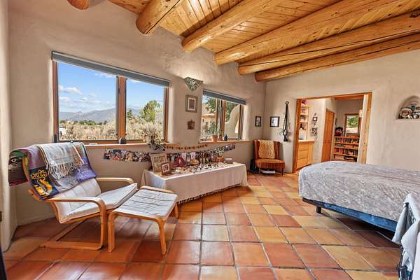 Two homes on two private acres within the quiet, highly sought-after Weimer neighborhood, this Pueblo-style residence showcases the beauty and of the mountains in every direction. The two-bedroom, two-bath main home features a charming kiva fireplace, punched tin lighting, and seven skylights that fill the interior with natural light. Wake up to dramatic views of El Salto from the primary bedroom with an en-suite bathroom that includes a travertine walk-in shower. Recent improvements include a TPO Extreme roof, new stucco and new skylights, ensuring comfort and low maintenance. A private drive leads to the home's attached carport, providing easy access and sheltered parking. Recline on the front covered portal to take in dramatic sunsets, or sip coffee on the back patio while watching the sunrise over the uninterrupted views of the canyon foothills. A separate two bedroom one bath casita has flag stone floors, sold wood cabinets and a built in bunco by the stove. Charming and "Taos Cool", it offers flexible guest or studio space, complete with garage parking, a private backyard, and a 15' x 14' storage room. This distinctive property blends Pueblo character, quality construction, and breathtaking scenery-a true reflection of Northern New Mexico living.