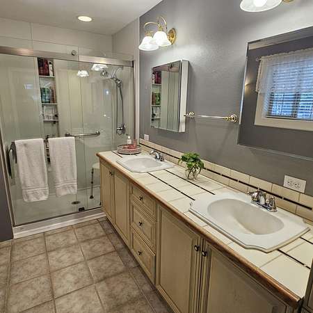 - Built-In Features, Ceiling Fan(s), Double Vanity, Fiberglass Stall Shower, Granite Counters, Linen Closet, Open Floorplan, Pantry, Primary Downstairs, Shower/Tub Combo, Solar Tube(s), Vaulted Ceiling(s)