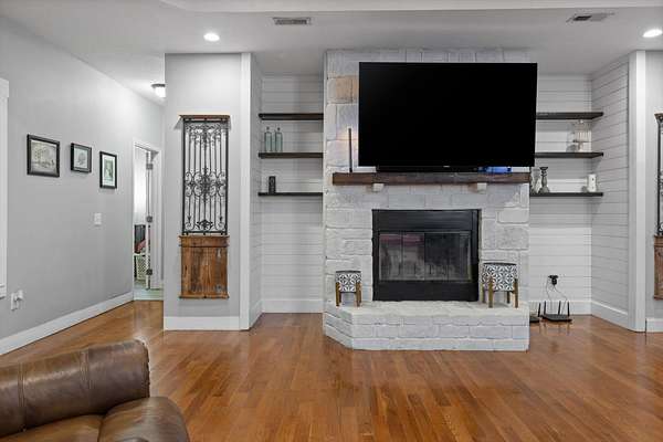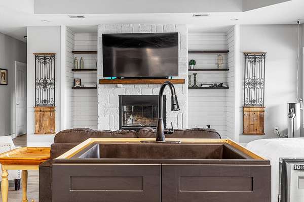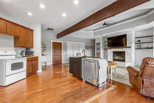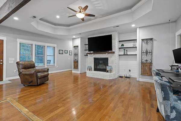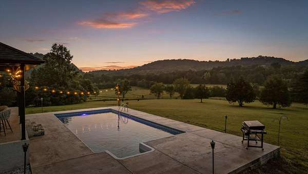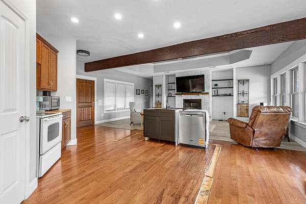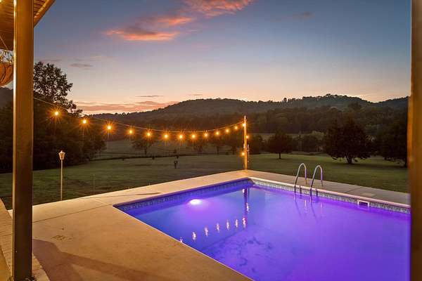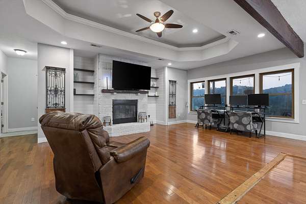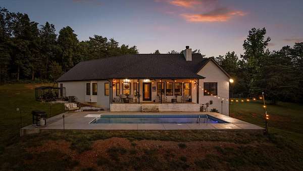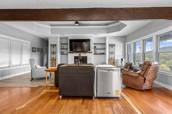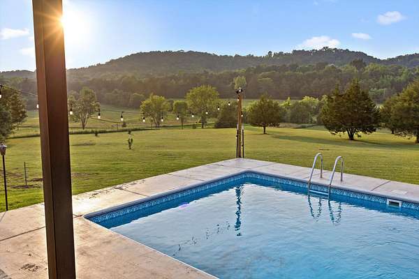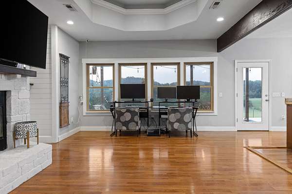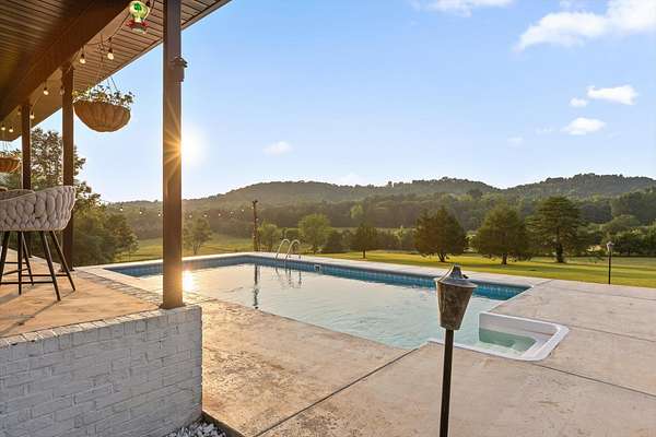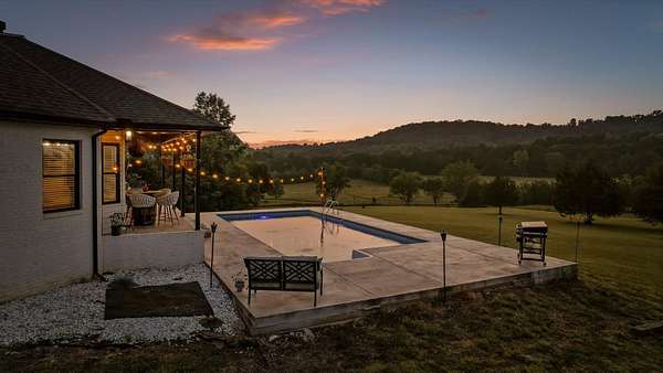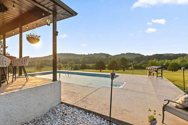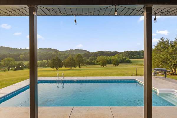 Inside, the home is mid-renovation and awaiting your final touches to bring its full potential to life. The open-concept living area is anchored by a white-brick hearth and wood-burning fireplace, highlighted by trayed ceilings, dark wood beams, and built-ins that blend rustic warmth with architectural character. Large windows fill the space with natural light and overlook the pool and rolling pasture beyond.