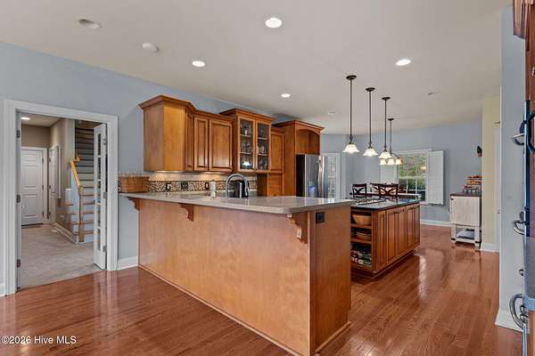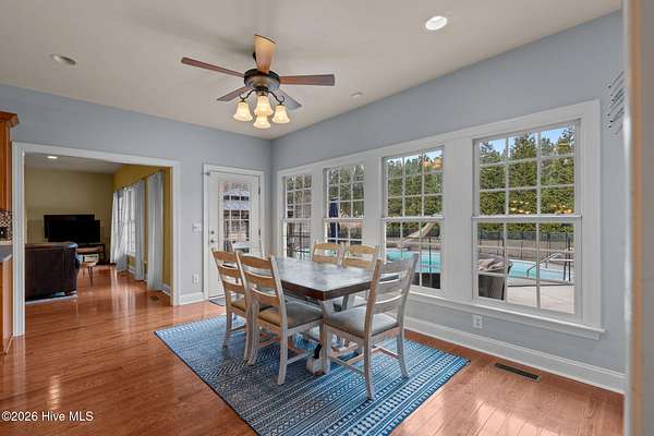 Located within the equestrian community of The Meadows at the Sandhills, this exceptional 5-bedroom, 4.5-bath custom home built by Alex Bowness, sits on 6 private acres and offers refined living paired with premier equestrian amenities. Residents enjoy approximately 10 miles of riding trails and a common riding arena, creating a true horse-friendly lifestyle. The kitchen has all stainless steel appliances with a double oven and 5 burner gas cooktop, breakfast nook, formal dining room and bar seating. The Carolina room has its own gas burning fireplace and ample natural light with pool views. The thoughtfully designed first-floor primary suite is a luxurious retreat filled with natural light, featuring a spa-inspired bathroom with dual vanities, a soaking garden tub, and a beautifully tiled walk-in shower. His & Hers custom walk-in closets with built-in storage completes the suite. The second level is equally impressive, boasting four spacious bedrooms, all with walk-in closets, including two bedrooms with connected bathrooms. Additional upper-level spaces include a bonus room, den, Laundry chute and recreation room, offering exceptional flexibility. The entire first floor is hardwoods & spacious living area includes a gas burning fireplace, central vac, dual staircases. Outdoor living feels like a private resort with a built-in swimming pool with slide, pergola, and covered patio, all surrounded by mature privacy trees. A whole-home generator provides peace of mind and services both the main residence and a separate unit for the barn. RV Hookups, Shed. The barn is thoughtfully designed with a separate gated entrance, three 12x12 stalls with mats & drainage, living quarters, bathroom, laundry, and loft storage, all supported by a separate septic system. The property also includes four fenced paddocks, offering excellent functionality for equestrian use. 7 miles to Carolina Horse Park, Less than 20 minutes to Pinehurst & Southern Pines.