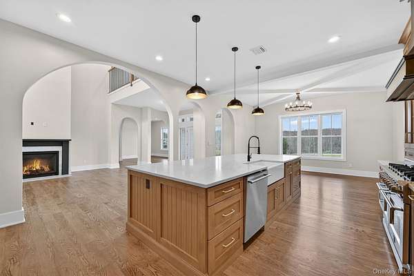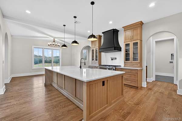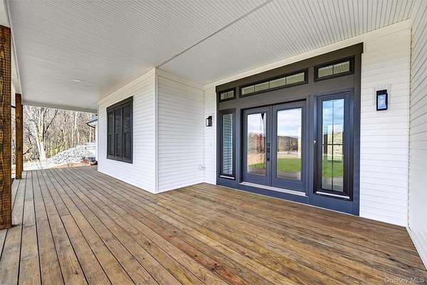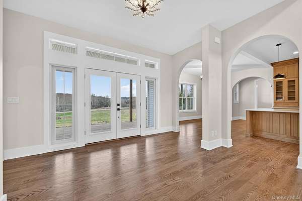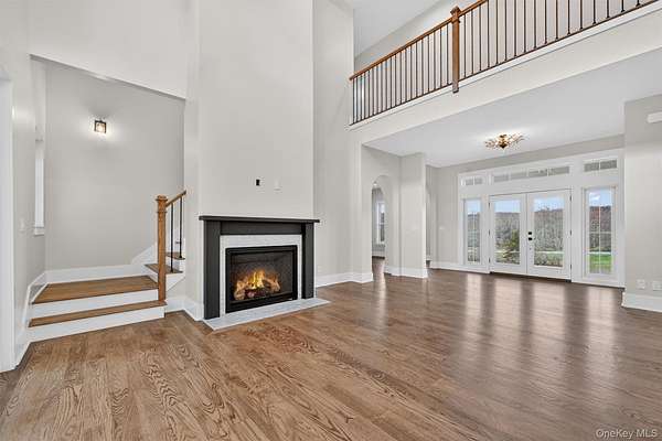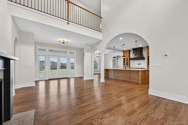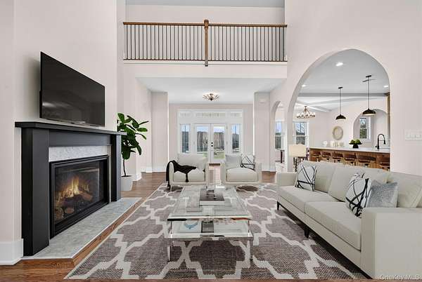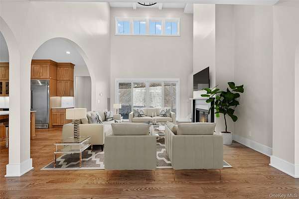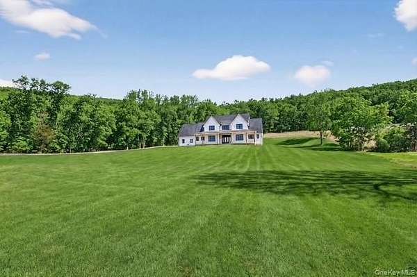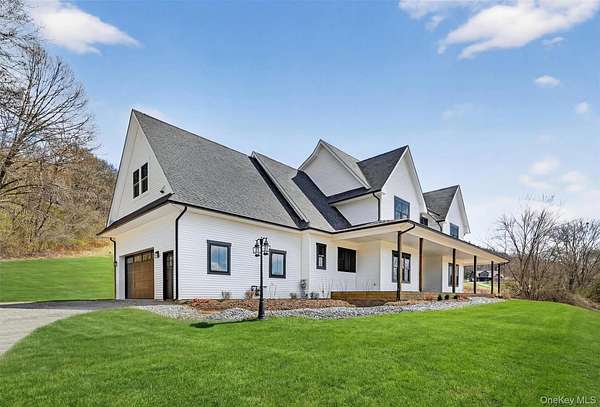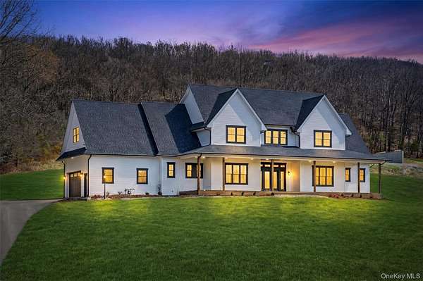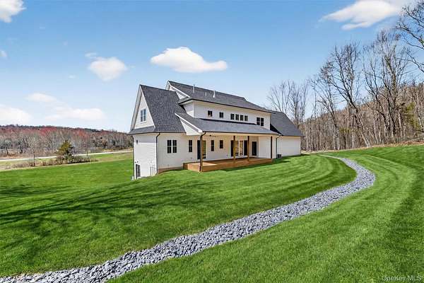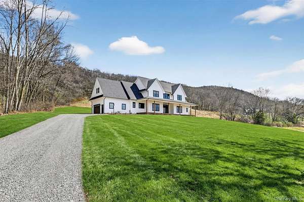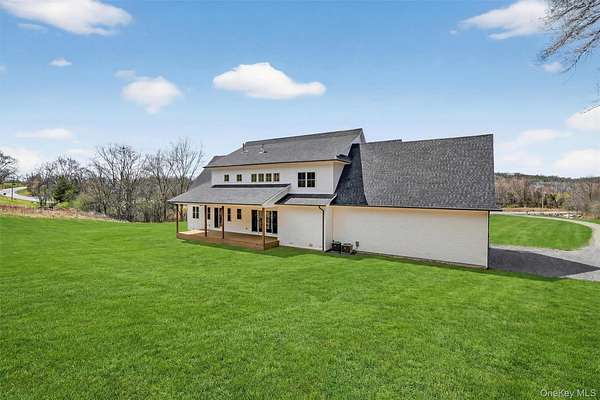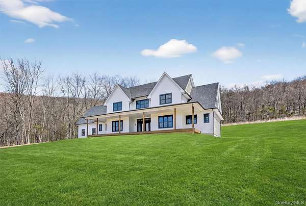 Set gracefully on 3.8 private acres within the highly coveted Warwick School District, this exceptional custom home offers a rare blend of architectural elegance and refined living. Surrounded by a collection of equally distinguished residences, the property provides an expansive, park-like sanctuary while remaining nestled in the heart of one of the region's most sought-after communities. Spanning over 4,500 square feet of meticulously finished living space, with more than 6,800 total square feet including an expansive unfinished lower level, the residence showcases thoughtful design and elevated craftsmanship at every turn. A dramatic double-height great room anchored by a striking gas fireplace creates a grand yet inviting focal point, while graceful arched openings and upgraded black windows lend a timeless, sophisticated aesthetic. The main-level primary suite is thoughtfully positioned as a private retreat, complete with a spa-inspired bath and exclusive access to a deck overlooking the serene, park-like grounds. Designed with both everyday living and entertaining in mind, the home features a well-appointed butler's pantry, media room, elegant lounge areas, a dedicated office nook, and an upper-level catwalk and loft that further enhance its architectural character. The unfinished lower level presents a blank canvas for customization-ideal for a private fitness studio, wine cellar, or full-scale entertainment space. Outdoors, a classic rocking-chair front porch welcomes you, while the surrounding acreage offers exceptional privacy without sacrificing accessibility. Natural gas availability adds both convenience and long-term value. Perfectly situated for commuters, the property is moments from major roadways and within walking distance to Tin Barn Brewing, while also enjoying close proximity to Warwick's renowned wineries, farm markets, and dining destinations.