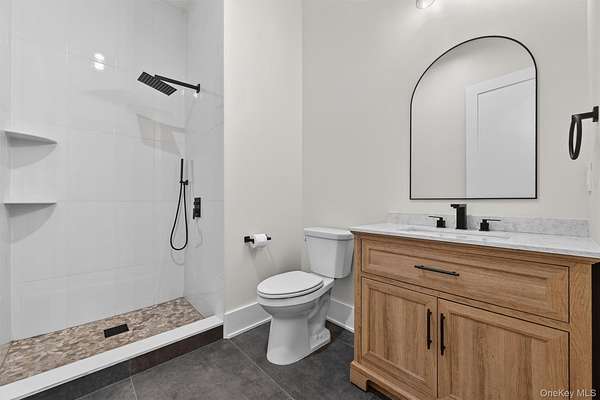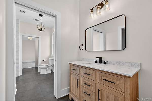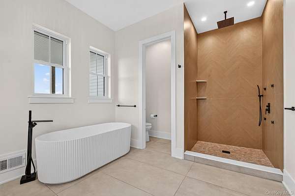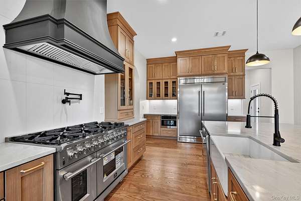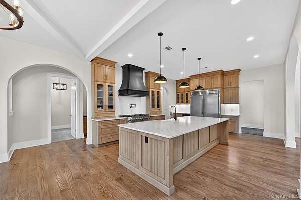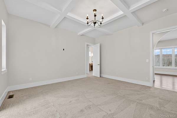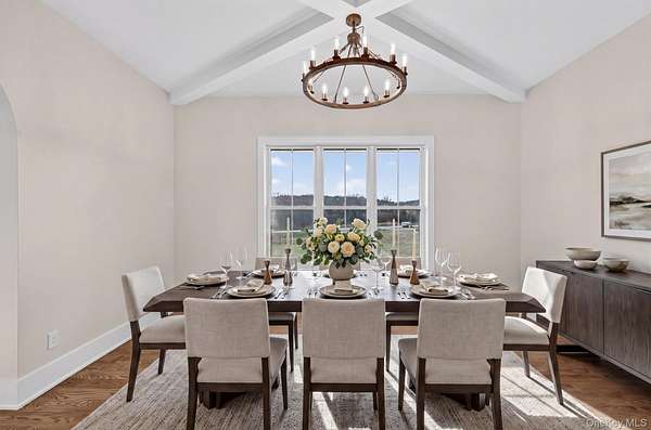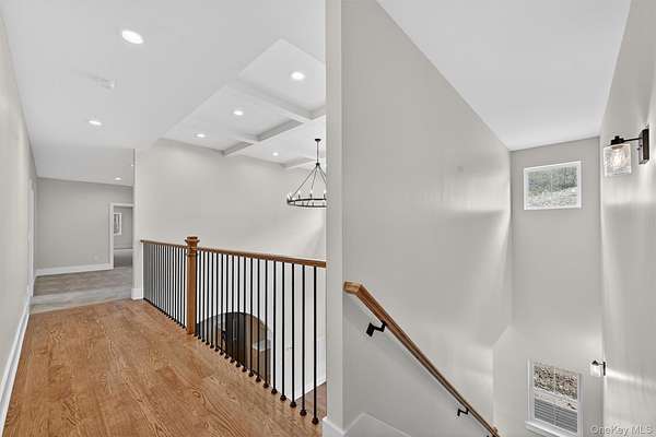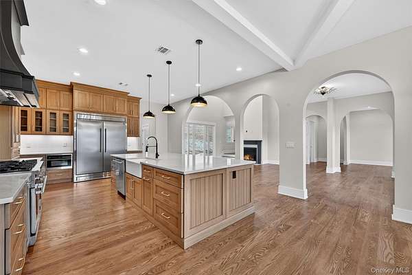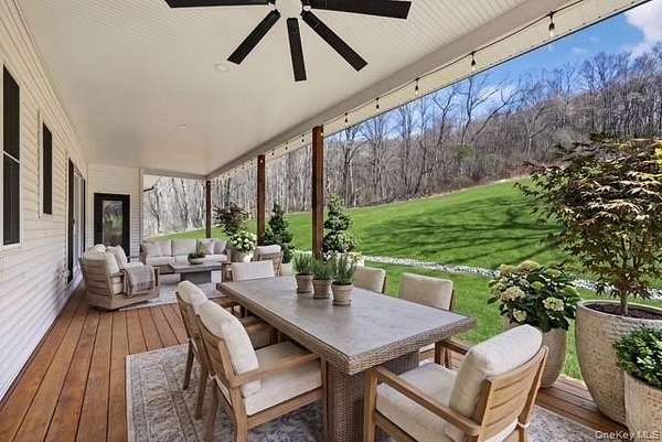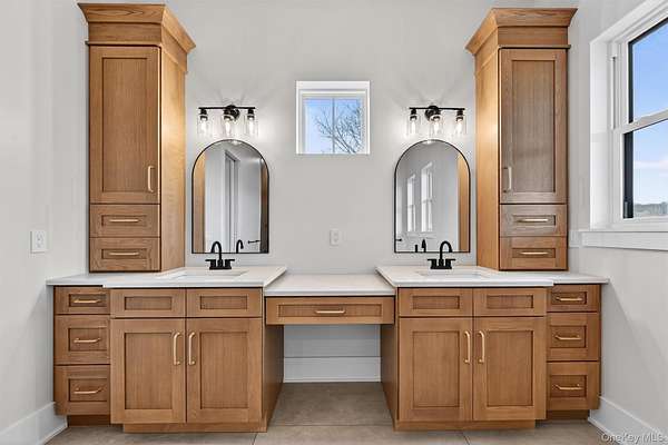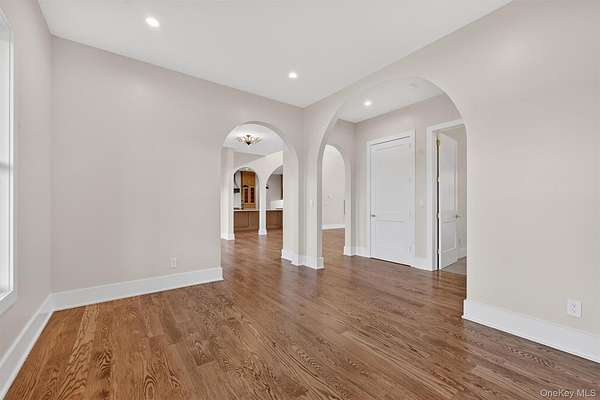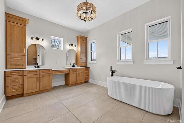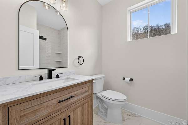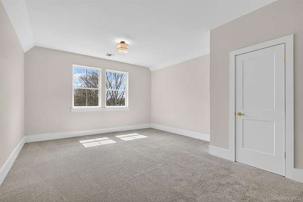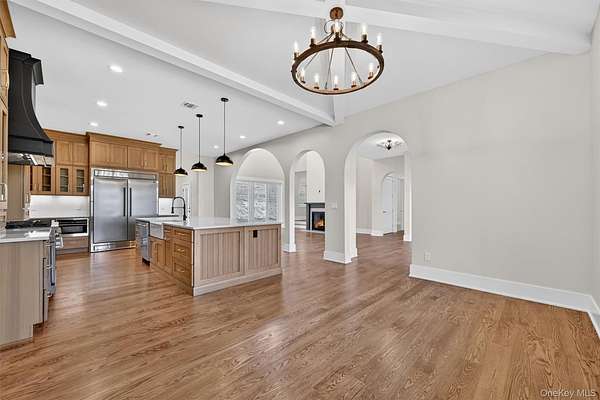 Set gracefully on 3.8 private acres within the highly coveted Warwick School District, this exceptional custom home offers a rare blend of architectural elegance and refined living. Surrounded by a collection of equally distinguished residences, the property provides an expansive, park-like sanctuary while remaining nestled in the heart of one of the region's most sought-after communities. Spanning over 4,500 square feet of meticulously finished living space, with more than 6,800 total square feet including an expansive unfinished lower level, the residence showcases thoughtful design and elevated craftsmanship at every turn. A dramatic double-height great room anchored by a striking gas fireplace creates a grand yet inviting focal point, while graceful arched openings and upgraded black windows lend a timeless, sophisticated aesthetic. The main-level primary suite is thoughtfully positioned as a private retreat, complete with a spa-inspired bath and exclusive access to a deck overlooking the serene, park-like grounds. Designed with both everyday living and entertaining in mind, the home features a well-appointed butler's pantry, media room, elegant lounge areas, a dedicated office nook, and an upper-level catwalk and loft that further enhance its architectural character. The unfinished lower level presents a blank canvas for customization-ideal for a private fitness studio, wine cellar, or full-scale entertainment space. Outdoors, a classic rocking-chair front porch welcomes you, while the surrounding acreage offers exceptional privacy without sacrificing accessibility. Natural gas availability adds both convenience and long-term value. Perfectly situated for commuters, the property is moments from major roadways and within walking distance to Tin Barn Brewing, while also enjoying close proximity to Warwick's renowned wineries, farm markets, and dining destinations.