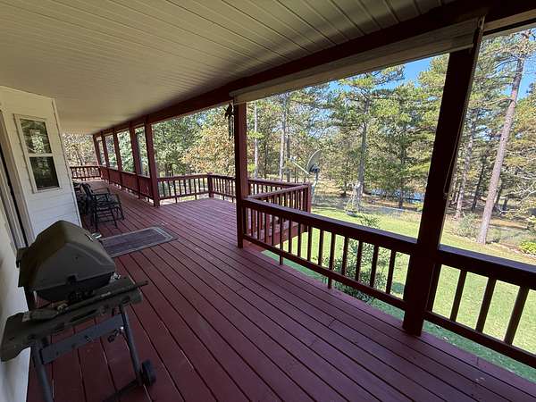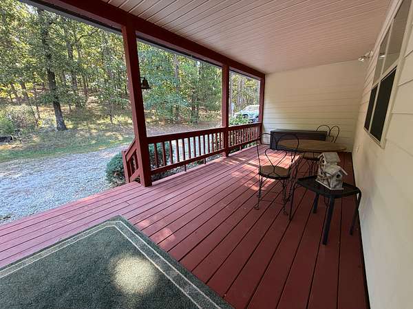 The property features nice, covered porches, a large deck for entertaining, a fenced-in area for livestock, a nice pond, and multiple spacious outbuildings. The yard is secured with chain-link fencing, making it ideal for pets and family.