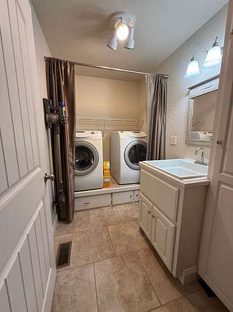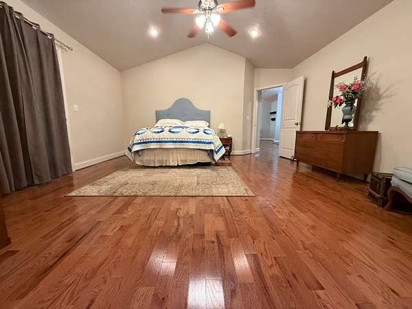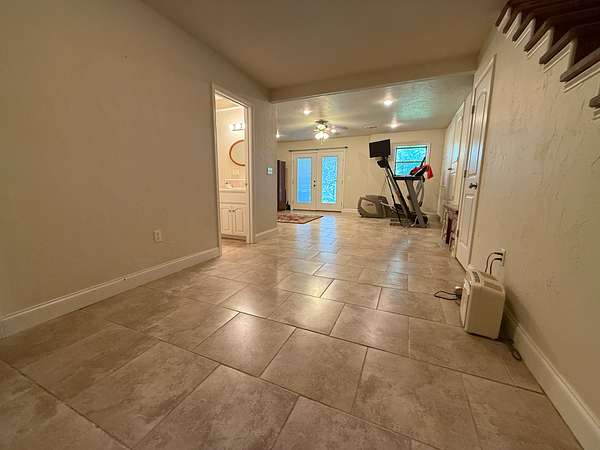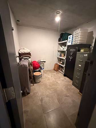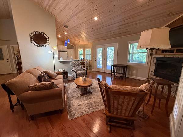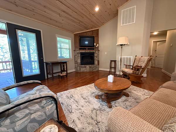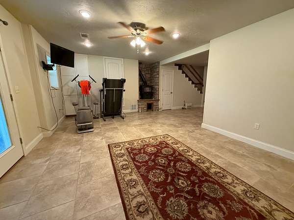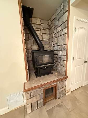 Inside, the home boasts a spacious layout. The main level includes three bedrooms, a large utility room, and a cozy gas log fireplace, while the walkout basement offers an additional room that can be used as a fourth bedroom, a woodburning stove, and a secure safe room for peace of mind.