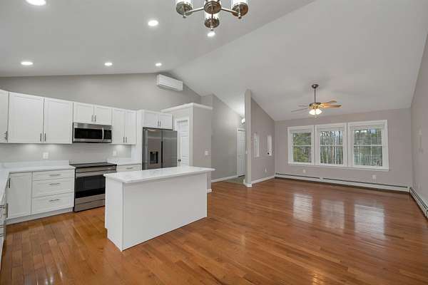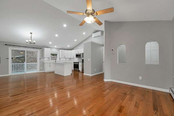 Welcome to 145 Ossipee Mountain Road: an upgraded 2021 ranch that checks every box and then keeps going! With approximately 1,863 sq ft of finished living space, this home delivers the space you want with the easy, modern feel everyone’s chasing. The open-concept main level is bright and inviting with vaulted ceilings, hardwood floors, and a kitchen that steals the show; quartz countertops, crisp cabinetry, and a recently installed induction range that’s as sleek as it is functional! The primary suite offers a private bath and walk-in closet, plus two additional bedrooms, a full bath, and first-floor laundry for true one-level convenience. Downstairs, the finished lower level adds the perfect bonus space for a family room, media setup, home gym, or game room; whatever fits your lifestyle! Outside, the maintenance-free features continue with vinyl siding, Trex decking and railings, and energy-efficient windows and LED lighting. You’ll also love the attached finished 24x24 garage, plus a finished shed with its own mini-split: ideal as a home office, studio, hobby space, or year-round hangout. Set in the heart of Ossipee with quick access to lakes, trails, and ski areas, this is the kind of move-in-ready property that feels like a smart upgrade the second you walk in. If you’ve been waiting for a “no excuses” home that’s done right, this is the one!