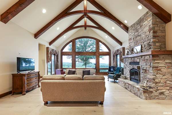 56,000 trees planted...White Oaks producing acorns Over mile of Spoon River Frontage Exceptional smallmouth bass Stocked Lake w/ fish feeder Load with wildlife food plots Miles or trails Beach area on Spoon River for camping and launching kayaks 40 tillable acres with 125 P.I. Large Barn for storage 137 acres in CREP New Furnace 2 hot water heaters 2 laundry rooms with 1 being off Primary bedroom for convenience New water filtration and well pump New hardwood floor in great room and primary bedroom Walking trails with mature harvestable White Oak and Walnut Unparalleled views Additional 3 car de-attached garage Excellent deer hunting Douglas fir beams Knotty Alder cabinetry Full-sized Thermador fridge & freezer Thermador commercial grade over/cooktop