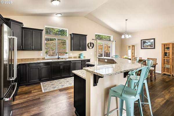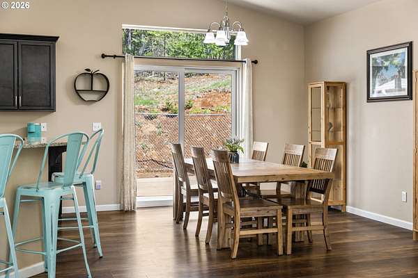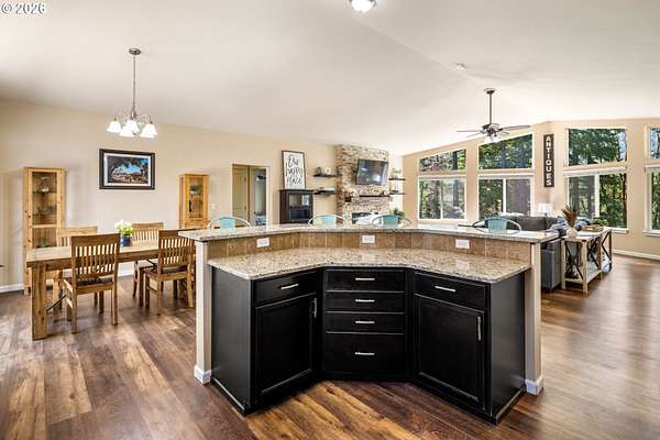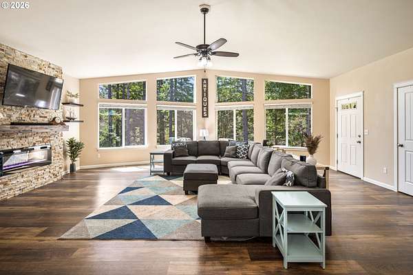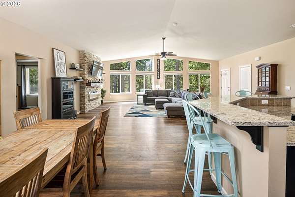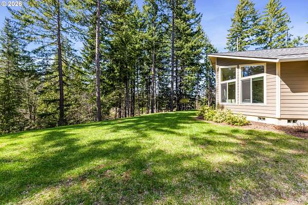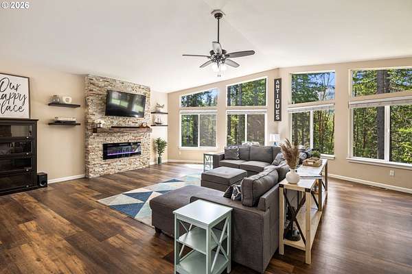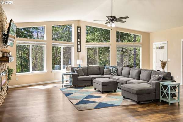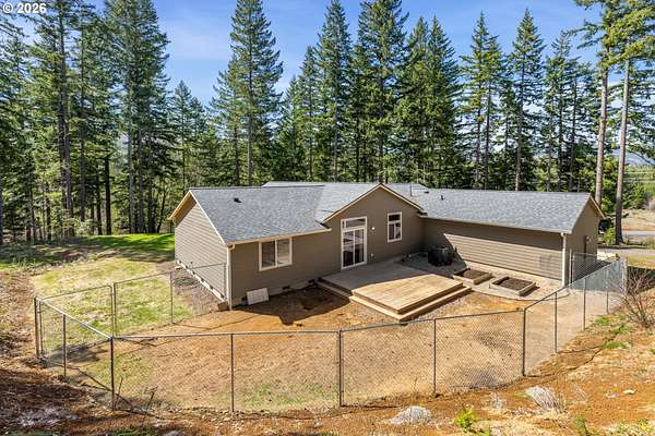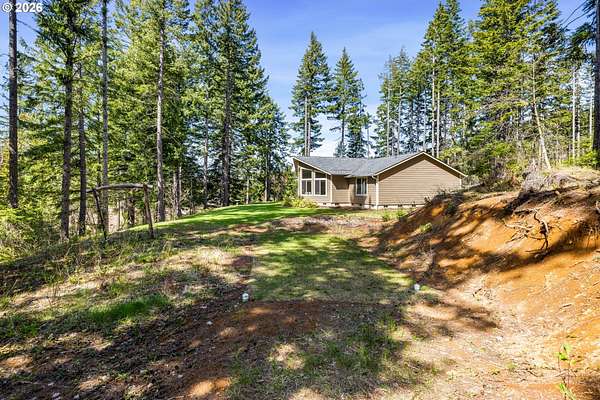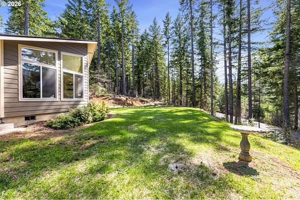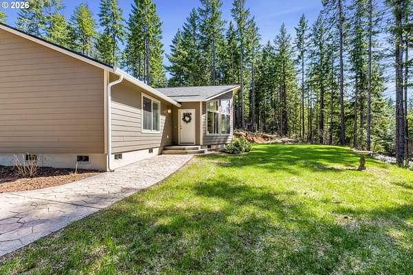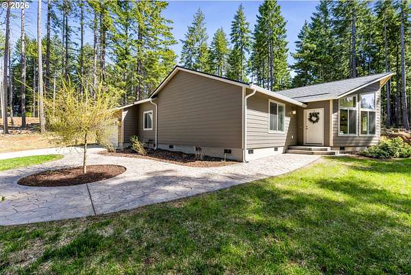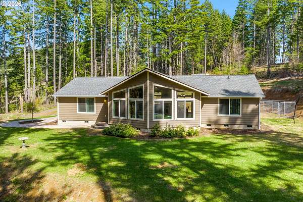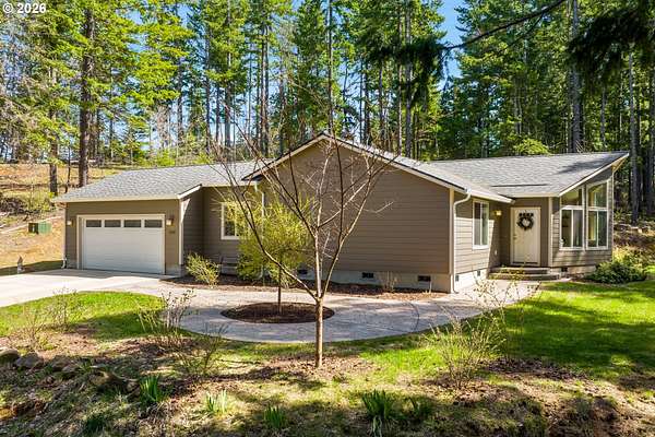 Tucked into a peaceful, wooded setting, this single-level Northwest home offers a rare sense of privacy and calm on 1.73 acres. Featuring 3 bedrooms, 2 bathrooms, and 2,024 square feet of living space, the home blends comfort with thoughtful design throughout. Inside, soaring vaulted ceilings and expansive windows flood the open-concept living area with natural light while framing tranquil forest views in every direction. The great room is designed for both comfort and connection, anchored by a striking floor-to-ceiling stone fireplace and seamlessly flowing into a spacious kitchen with granite countertops, a prep island, pantry, and generous breakfast bar. Sliding doors lead to the back deck, extending your living space outdoors and overlooking a fenced yard-ideal for pets, play, or simply enjoying the quiet surroundings. The primary suite provides a relaxing retreat with a soaking tub, beautifully updated walk-in tile shower, dual sinks and walk-in closet. Additional highlights include a functional mudroom/laundry area off the attached two-car garage and a welcoming stamped concrete entry. This is a home where thoughtful design meets privacy, serenity, and everyday livability. Hike, bike or enjoy the outdoors right outside your door. Just 9 minutes from the Hood River Bridge, 12 minutes to White Salmon, and just over an hour to Portland if you are looking for a Gorge retreat!