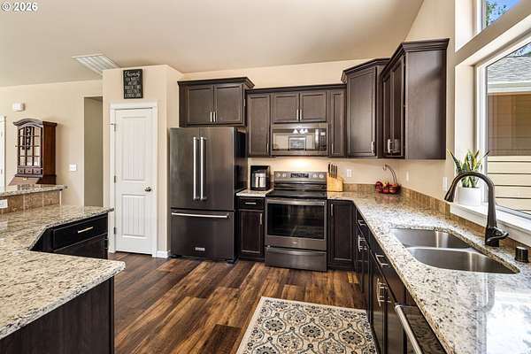 - Dishwasher, Free Standing Range, Free Standing Refrigerator, Granite, Island, Microwave, Range Hood, Stainless Steel Appliance