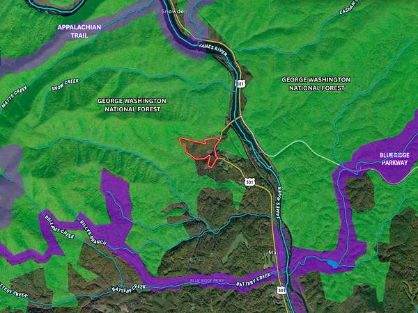 Accessibility is often the trade-off for seclusion, but not here. The property features 1,400 feet of frontage on Lee Jackson Hwy in Big Island, Virginia, paired with additional access from Hunt Club Rd, ensuring you can reach your retreat with ease. Despite its privacy, you are within two miles of some of Virginia's most iconic outdoor recreation destinations and natural landmarks: