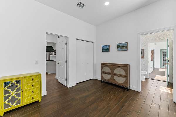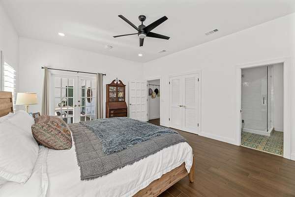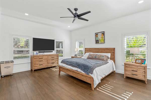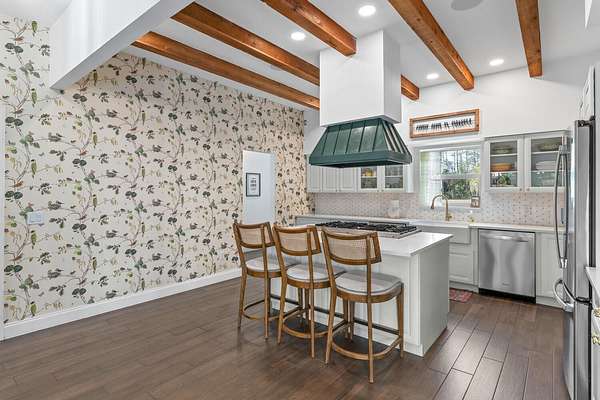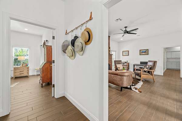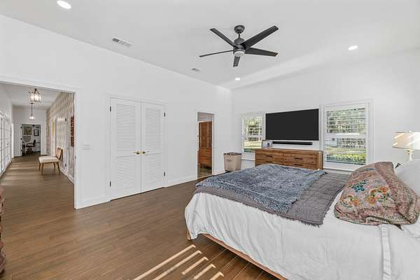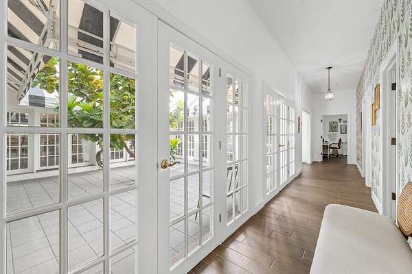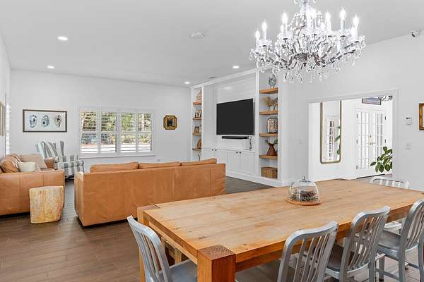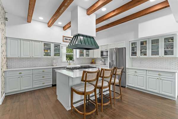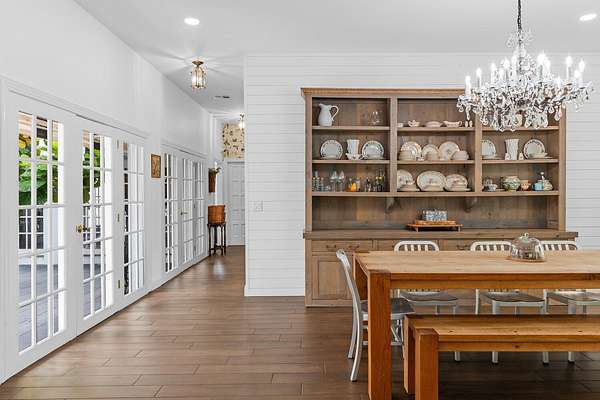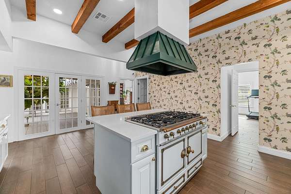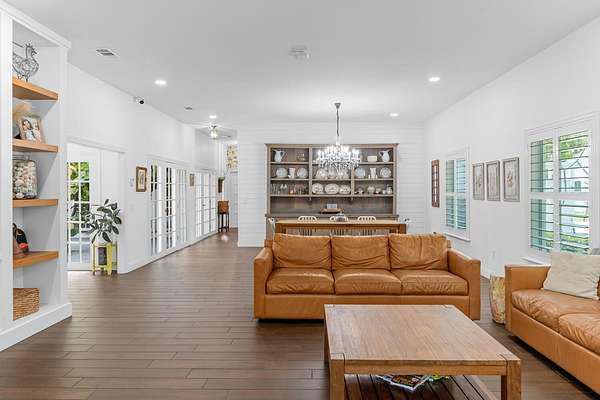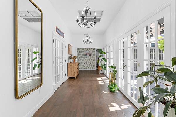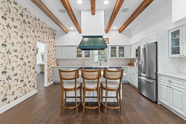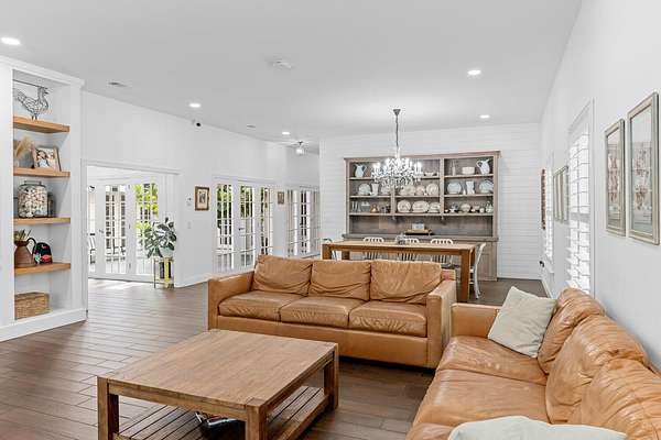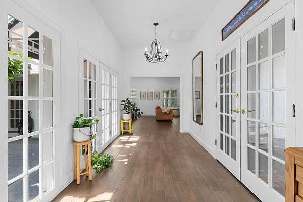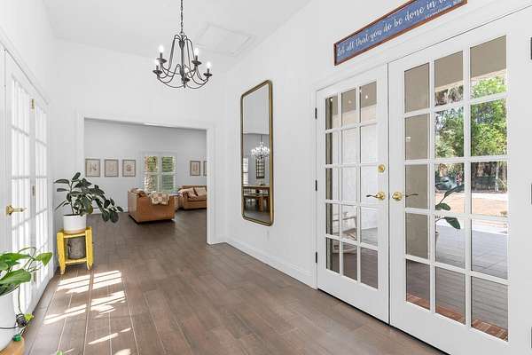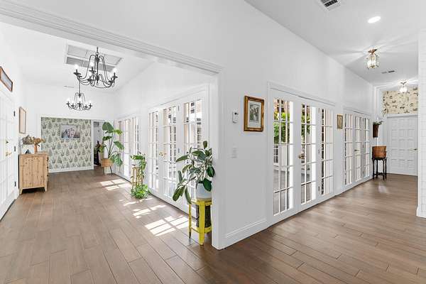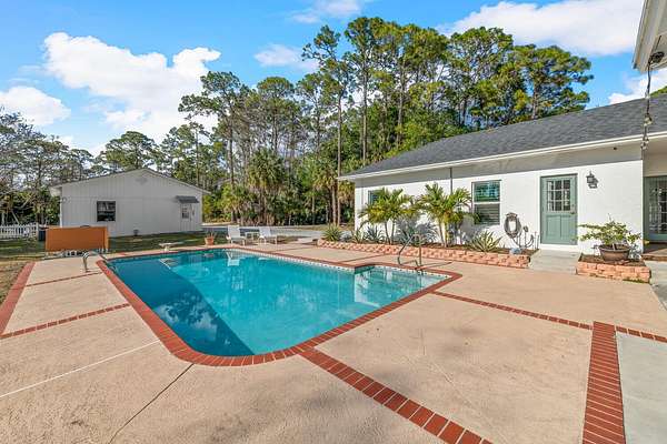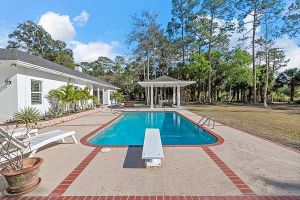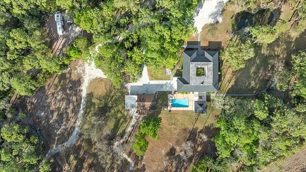 Situated on 10 tranquil, fully fenced acres, this completely renovated courtyard pool home is a rare blend of refined French Country design and peaceful country living. Renovation completed in 2022, the home was thoughtfully gutted and rebuilt with major upgrades including impact windows, new roof, new reverse osmosis system, and all-new interior finishes throughout. Offering 5 bedrooms, 3 full bathrooms, and a 3-car garage with an attached carport ideal for tractors and equipment, this property delivers both elegance and functionality. It includes a new automatic gated entryway, partially cleared acreage, newly reinforced driveways throughout, partial irrigation around the home, and a sunset patio overlooking the pool, gazebo and fire pit. Light-filled and truly remarkable, the stunning interior showcases impeccable upgrades at every turn. A central courtyard bathes the home in natural sunlight, with soft rays cascading down hallways lined with elegant French doors, creating a warm and sophisticated atmosphere. The kitchen boasts a center island with gas stove, ample storage and lofty ceilings with exposed wood beams.
