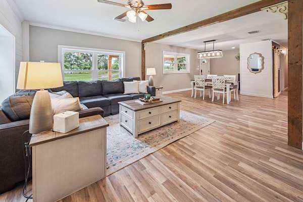 From the moment you arrive, you'll be welcomed by the timeless appeal of the home's cottage-style brick exterior, complemented by lush greenery and open skies that define North Florida country living. Inside, the open-concept layout creates a warm and inviting atmosphere, perfect for family gatherings or entertaining friends. The living room flows seamlessly into the kitchen and dining spaces, making it easy to host holidays or enjoy quiet evenings at home.