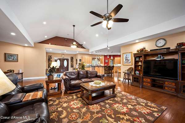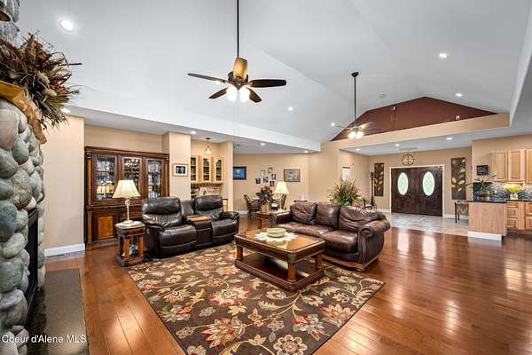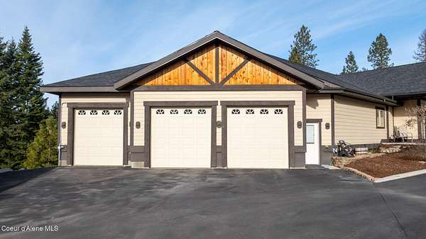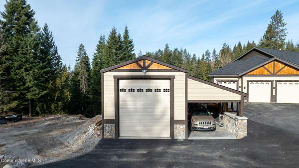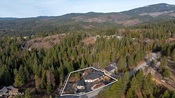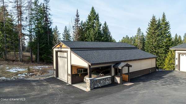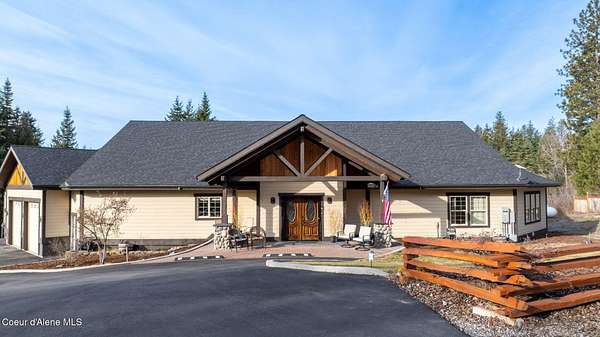 Custom built in 2020 on 1.89 peaceful, tree-lined acres in Rathdrum, this single-level home blends privacy, comfort, and functionality. Designed for multi-generational living or guests, it features two master suites, 4 spacious bedrooms, and 2.5 baths within an open-concept layout. Vaulted ceilings highlight the stunning custom rock fireplace as the focal point of the main living area. The 32x45 shop offers exceptional space for vehicles, storage, and hobbies. Entertain or unwind on the covered back deck complete with outdoor kitchen and hot tub. Permanent holiday soffit lighting adds year-round charm. Enjoy light CCRs, no HOA, private well, whole-house backup generator, and a convenient drive to town and easy commute to Spokane. BONUS: Option to assume current VA loan at 5.5% for qualified buyers.