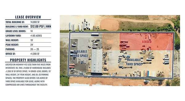 Located on highway 412 less than five miles from interstate-49, this 14,880 sf warehouse includes +-1,200 sf of office space, 14 grade-level doors, 19' wall height, 24' peak height, and 20-25 parking spaces.