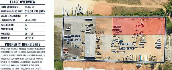 Lease Overview Total building sf: 14,880 sf. Building & yard rent: $12.00 psf | nnn. Grade level doors: 14. Laydown yard: +/-1.85 acres. Wall height: 19'. Peak height: 24'. Parking: 20-25. Office sf: +/-1,200 sf. Located on Highway 412 less than five miles from Interstate-49, this +/-14,880 SF warehouse includes +/-1,200 SF of office space, 14 grade-level doors, 19' wall height, 24' peak height, and 20-25 parking spaces. The property also offers 1.85 acres of yard space available for lease, along with compressed air lines throughout the facility, and pylon signage is available for additional visibility.