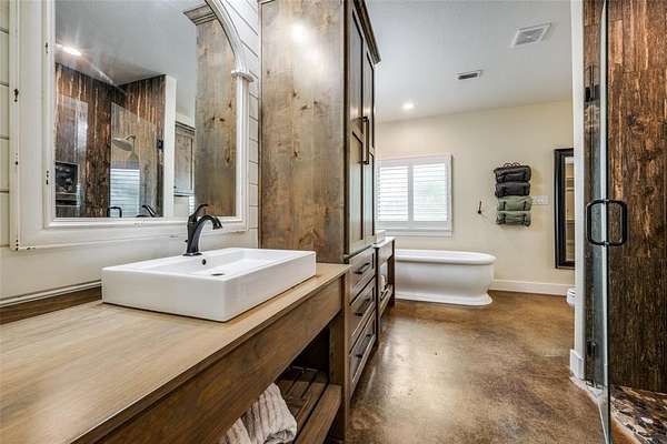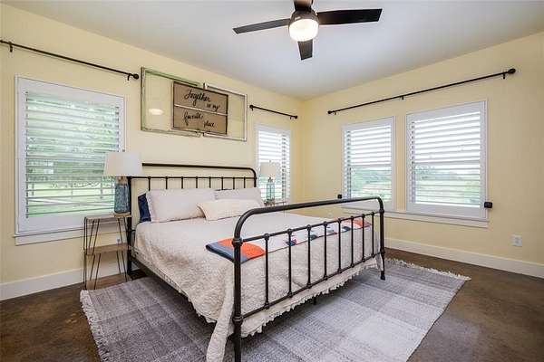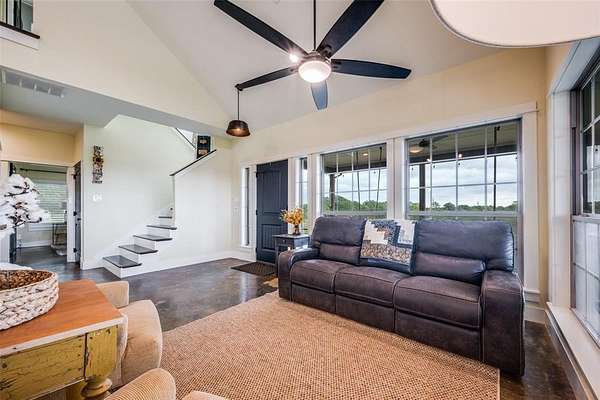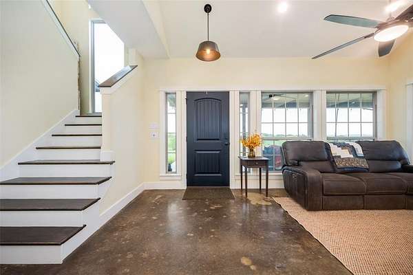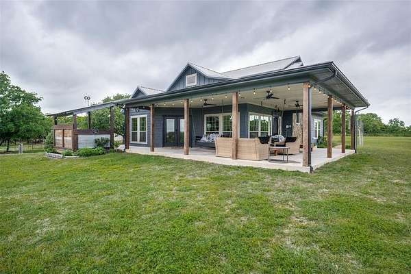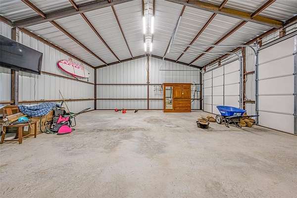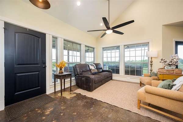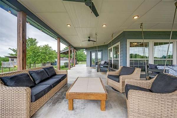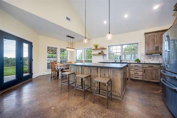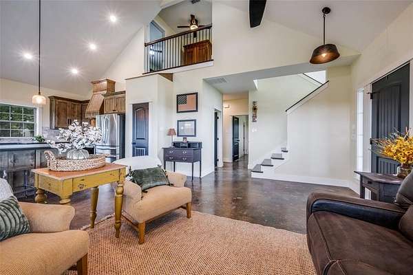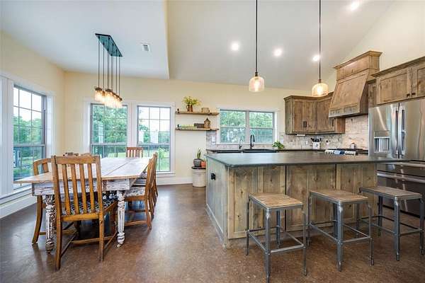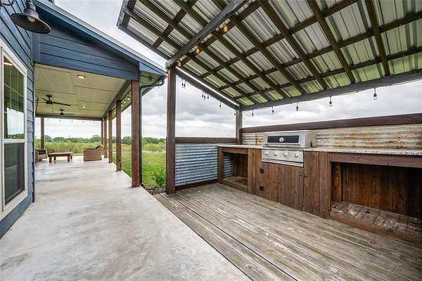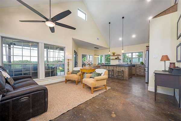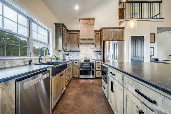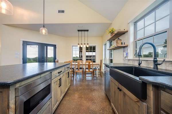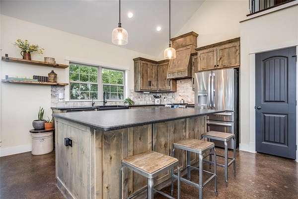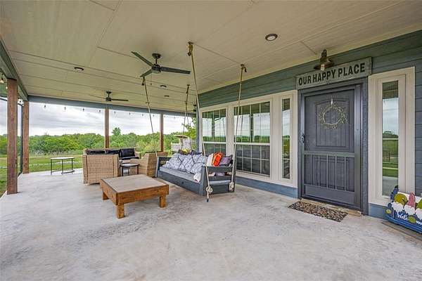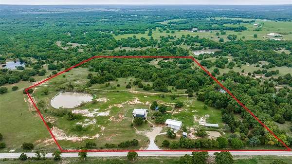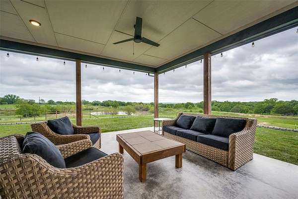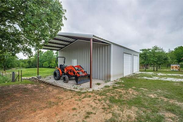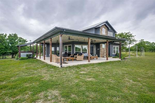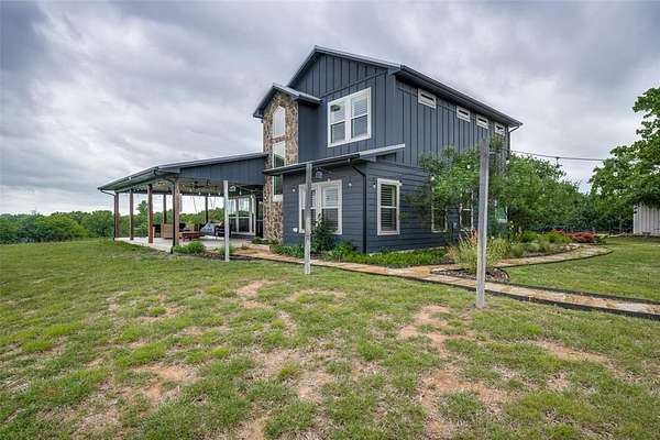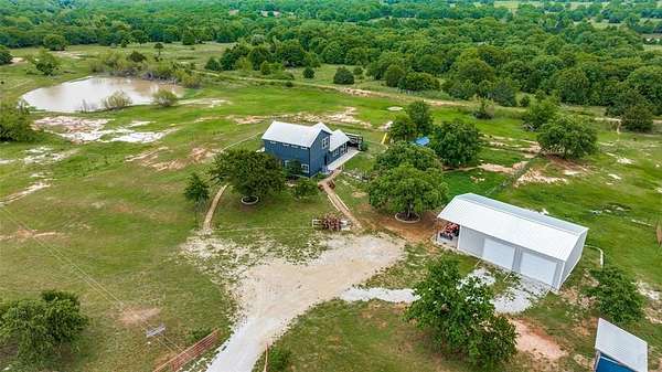 Escape the city for this stunning 25 acre retreat featuring rolling hills, a scenic pond, & total privacy. This 2019 custom built home combines modern efficiency with rustic charm, boasting spray foam insulation, a metal roof & private well. The foundation was poured with reinforced peers! Relax on the massive wrap around porch with swings overlooking the water or enjoy the outdoor kitchen. Inside, vaulted ceilings frame an open concept living area & a gourmet kitchen with a large island, gas cooktop, & farmhouse sink. The primary suite is a main floor with a deep garden tub, tiled shower, & a functional laundry room. Each spacious bedroom features its own private bathroom, ensuring comfort for guests. Hideout bunker or kids playroom is under the stairway. Enjoy a 30x40 powered shop with oversized doors as your garage. It complements the barn & Ag Wildlife-exempt land, perfect for horses or cattle. Located outside city limits, you have the freedom to enjoy fireworks and recreation on your own terms. This property offers the perfect blend of luxury, utility, and country freedom.