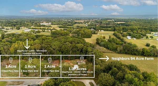 Bonus: Three neighboring 1-acre lots are already subdivided and soil tested for 3-bedroom homes, offering excellent investment or development potential.