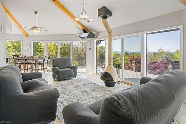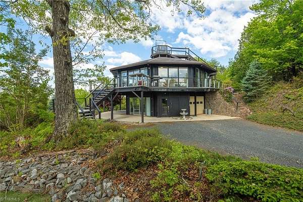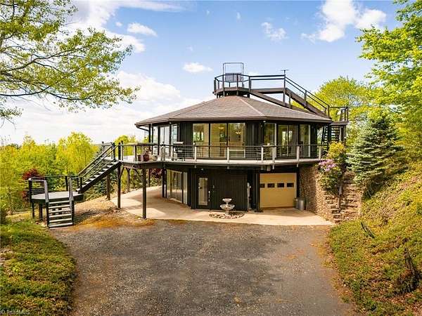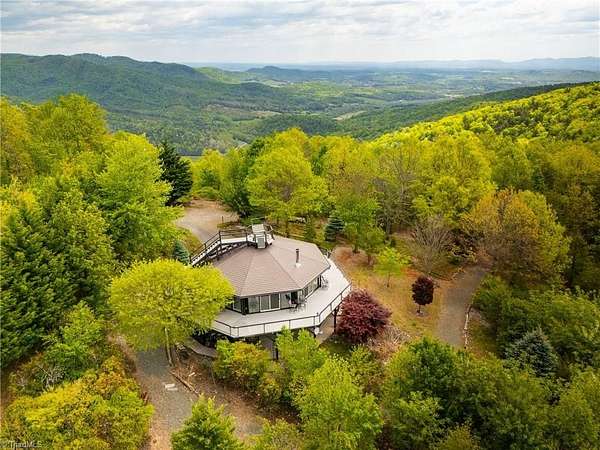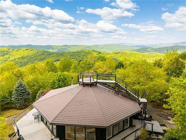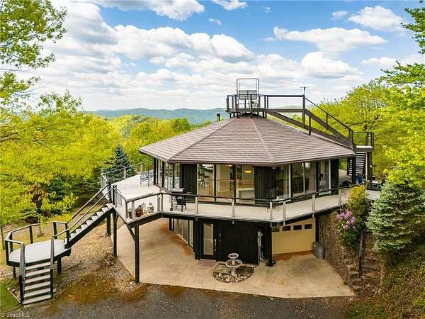 Round House|Panoramic Views|Observation Deck|Outdoor Living|ATV Community| Round house w/some of THE BEST VIEWS in Buck Mountain! Designed to showcase the peaceful surroundings, large sliding doors & open-concept layout bring the TREEHOUSE EXPERIENCE to life. Views from nearly every room. Featuring primary bedroom w/ensuite bathroom & guest bedroom on main level. Lower level has tons of potential w/efficiency suite w/kitchenette, ideal for multi-generational living or hosting weekend guests. 3 Levels of Outdoor Living: Covered patio, expansive wraparound open porch & observation deck w/panoramic mtn views for miles. Front row seat to breathtaking sunsets. Usable yard showcases mature landscaping & walking paths. Garage storage for ATV & gear. Flat driveway parking. Easily accessible. Fiber Optic. AMENITIES: ATV&Hiking Trails, Parks, Waterfalls, Pavilions, Helipad, Outdoor Activity Center TRAVEL: CLT 1hr, Winston 1hr40min, Raleigh 2hrs45min. 35 min: Boone, West Jefferson & Wilkesboro.