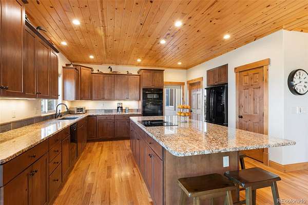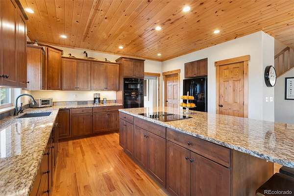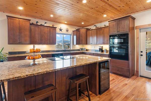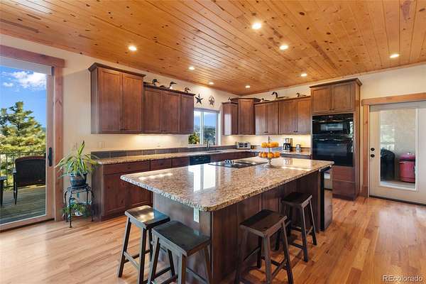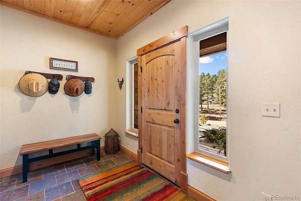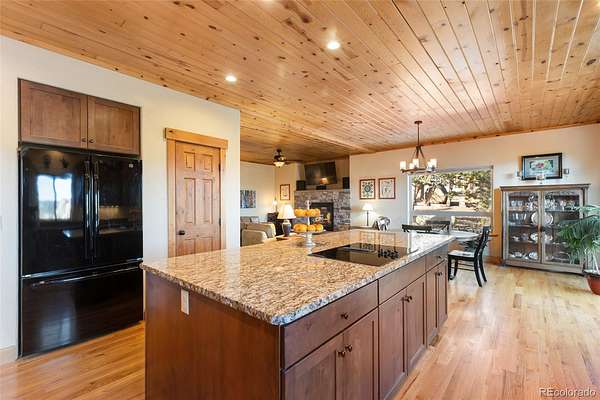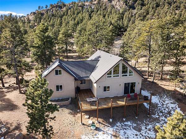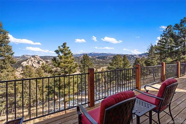 Exceptional Colorado mountain home on 2.10 acres featuring breathtaking mountain views, dramatic natural rock formations, and sweeping valley vistas. This pristine, custom-built residence showcases quality craftsmanship throughout, including tongue-and-groove ceilings, knotty pine doors, vinyl interior windows, Marvin windows, and rich hickory hardwood floors. The custom kitchen is highlighted by raw-edge granite countertops and a built-in wine cooler—perfect for entertaining and mountain living.
