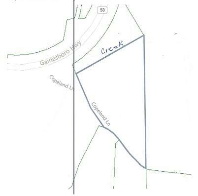 FR0M CCCH: E. Lake St to ST Hwy 53 S. / T. R. on ST Hwy 53 S. Cont approx 4.8 miles T. L. on Copeland Lane (Homer Copeland Lane). Cont over the bridge property starts in the middle of Wet Mill Creek stating after crossing the bridge on the Left with R.
