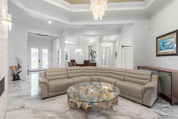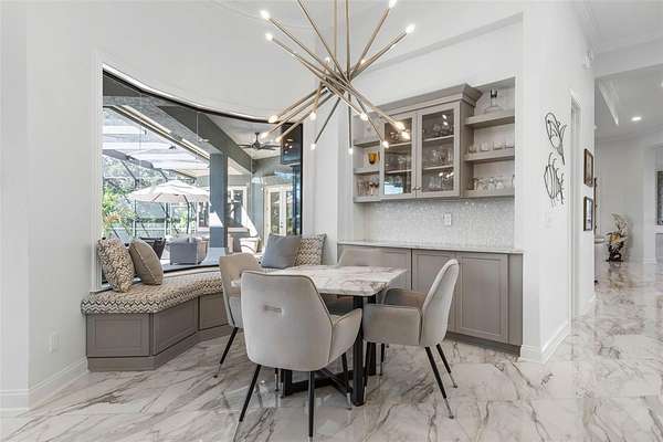 Designed for unforgettable entertaining, the expansive screened lanai offers wrap-around lounging and dining areas, an outdoor gas fireplace, and an exceptional summer kitchen complete with a wine cooler and premium finishes. The solar-heated saltwater infinity-edge pool, accented by tranquil water features, overlooks sweeping Intracoastal views.
