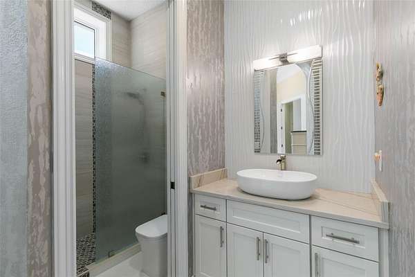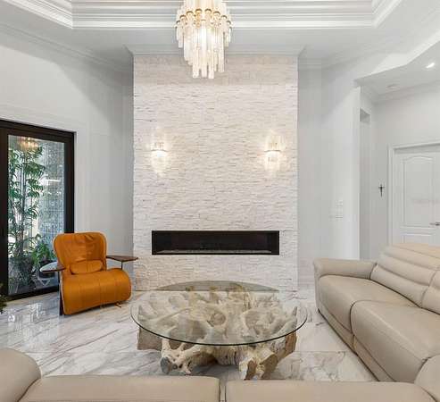 From the moment you arrive, elevated craftsmanship and meticulous attention to detail are immediately apparent. The open-concept layout spans over 5,500 square feet of beautifully curated living space, featuring a formal dining room and an elegant living area highlighted by a gas fireplace and new porcelain tile flooring throughout.