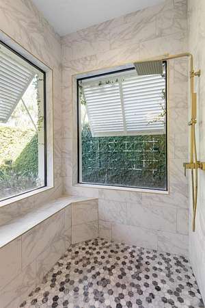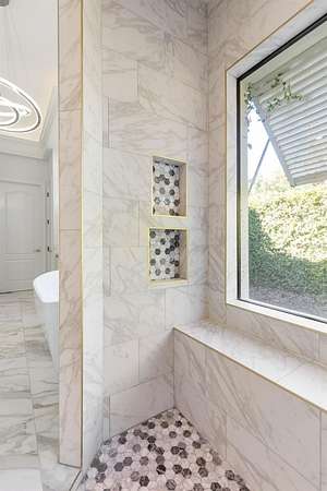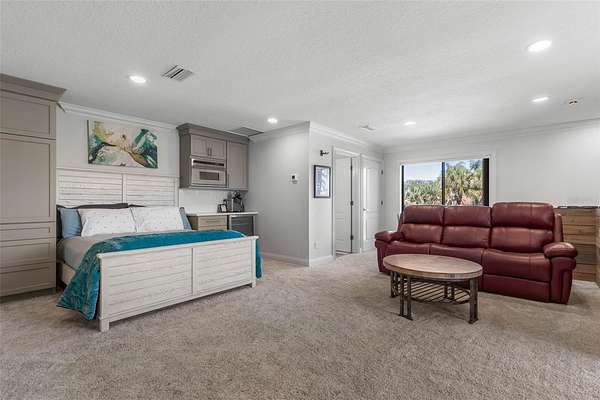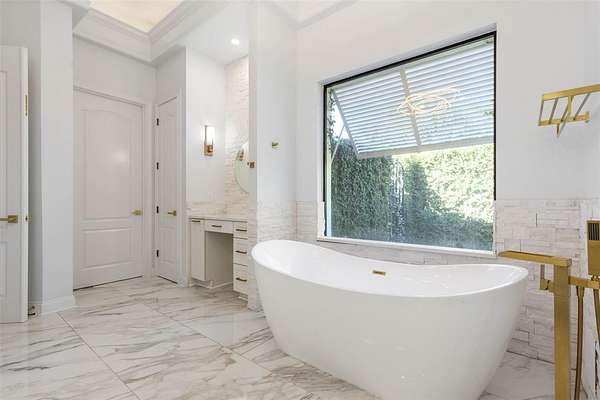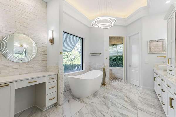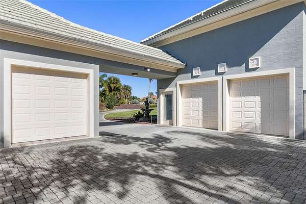 The primary suite serves as a private waterfront sanctuary, offering tranquil water views and a spa-inspired ensuite featuring a luxurious soaking tub overlooking a secluded secret garden, a beautifully appointed walk-in shower, and an additional sunlit steam shower. Three additional bedrooms--two with ensuite baths and one offering flexibility as an office or media room--along with private guest or in-law quarters positioned above the two-car garage with a separate entrance, complete the interior living spaces. A third garage bay, currently designed as a private home gym, is seamlessly connected to the main residence.