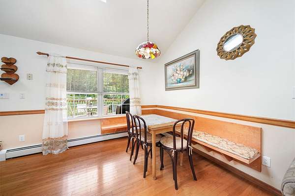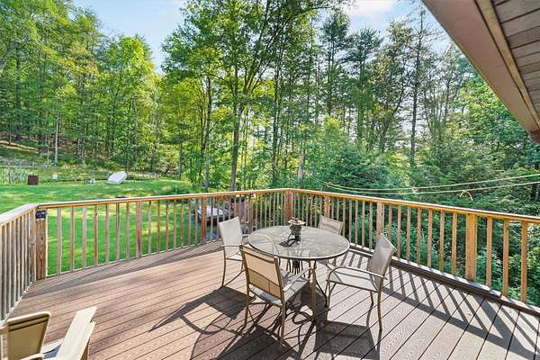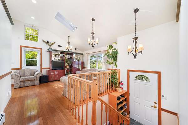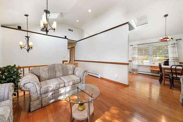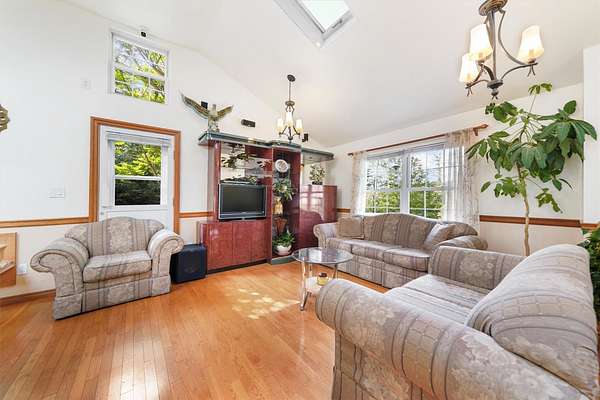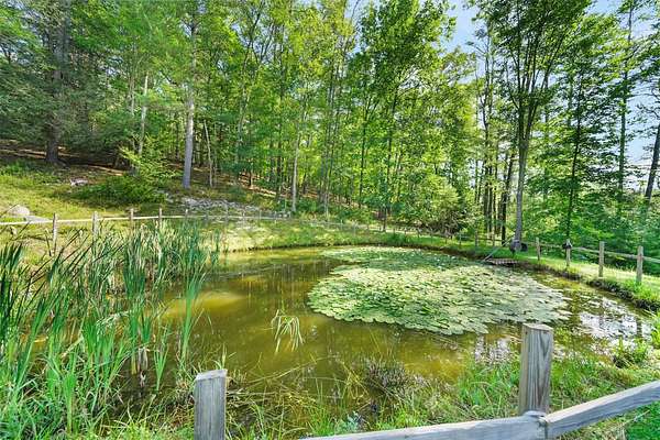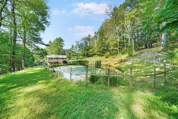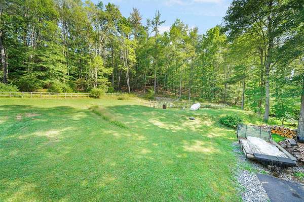 Discover this charming 3-bedroom, 1.5-bath home nestled in a peaceful, wooded setting with a pond and plenty of privacy. Step inside to find soaring ceilings and beautiful hardwood floors throughout, complemented by an abundance of natural light streaming through large windows and skylights. The bright kitchen features a convenient door leading to the back deck-perfect for sipping morning coffee, hosting a summer BBQ, or simply relaxing while taking in the tranquil woodland views. The full bathroom offers a walk-in shower for ease and comfort. Downstairs, the finished walk-out basement includes elegant tile flooring, a cozy wood-burning fireplace, a kitchenette, and a half bath-ideal for entertaining or guest space. This home also includes a detached two-car garage and is surrounded by the serene beauty of nature, offering a true sense of retreat while still being within reach of amenities.