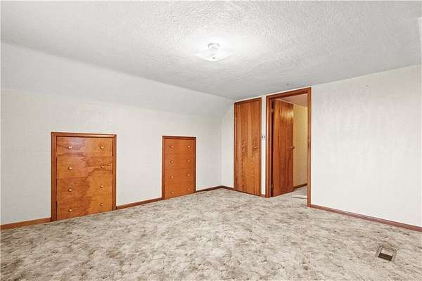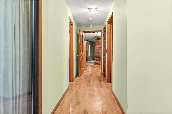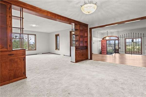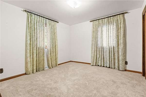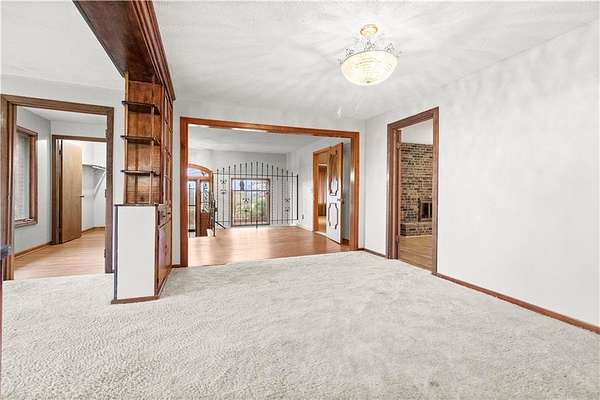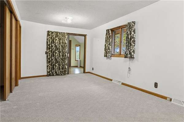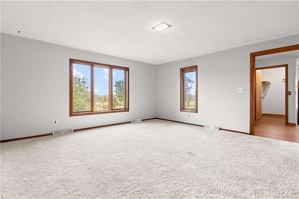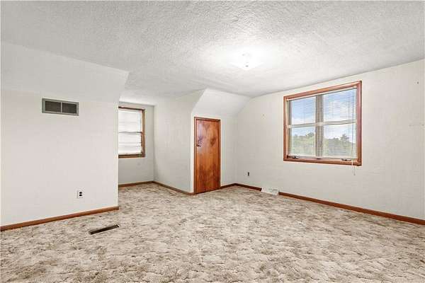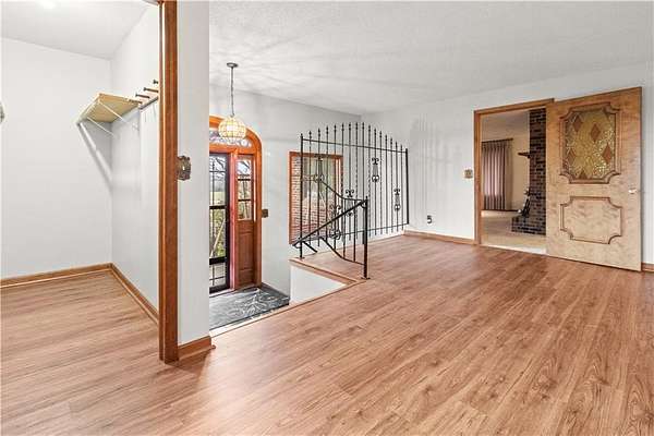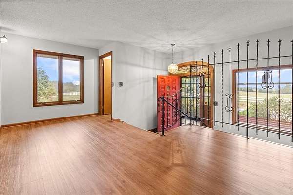 5-Acre Private Estate with Classic Farmhouse Charm! Discover the tranquility of country living with this classic two-story residence, perfectly situated on 5 expansive acres of lush, rolling green space. The home features a timeless exterior defined by rich red brick construction and a dark shingle roof, accented by charming dormer windows that hint at the generous living space inside. The sprawling acreage offers privacy, beautiful views, and endless potential for gardening, recreation, or equestrian pursuits, framed by mature trees and fencing. Traditional Interiors with Warm Wood Accents! Step inside to find voluminous, light-filled rooms with an abundance of original, character-filled details. The main level features a large living area centered around an impressive, floor-to-ceiling brick fireplace, providing a cozy focal point and architectural separation from the kitchen. This area is finished with soft, neutral carpeting and contrasting natural wood trim. The heart of the home is a wide-open kitchen and dining area boasting beautiful hardwood flooring. It is appointed with ample natural oak cabinetry and features a classic tiled backsplash, ready for the chef's touch. A built-in oven and microwave unit completes the functional layout. Upstairs offers substantial bedrooms and a unique bonus space. A standout feature is this large vaulted room, which showcases stunning exposed wood beams across the ceiling, giving it a dramatic, rustic-chic atmosphere--perfect for a studio, or recreation room. Additional bedrooms are generously sized, featuring plush carpeting, bright windows, and the potential for personalization. This property provides the perfect blend of private, expansive outdoor living and a warm, classic interior with excellent "bones" awaiting your personal upgrades and style!