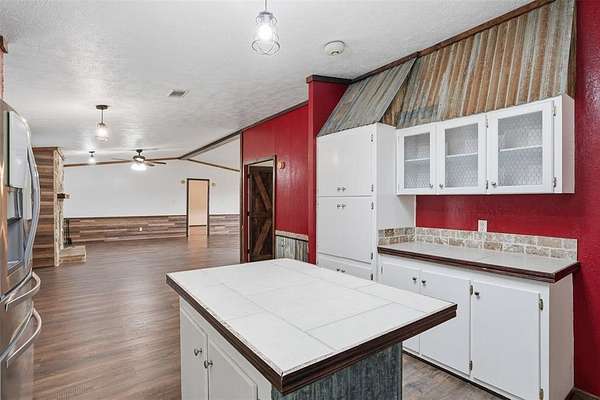 - Cable TV Available, Decorative Lighting, Double Vanity, Eat-In Kitchen, Kitchen Island, Natural Woodwork, Open Floorplan, Tile Counters