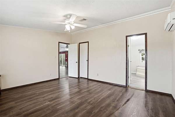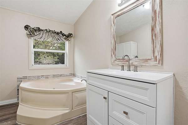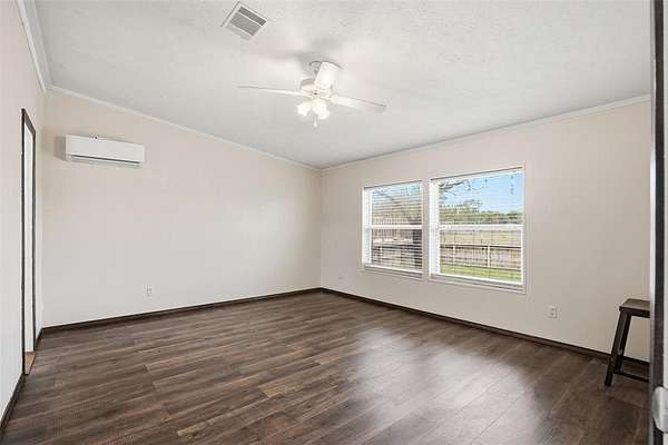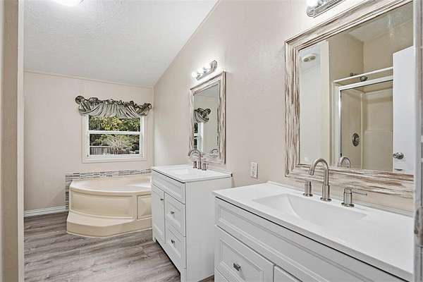 The primary suite is a true retreat, offering a generously sized bedroom, an expansive walk-in closet, and a spa-like bathroom complete with a jetted tub, separate shower, and dual vanities. A dedicated mini-split AC and heating system allows for personalized comfort without running the central system.