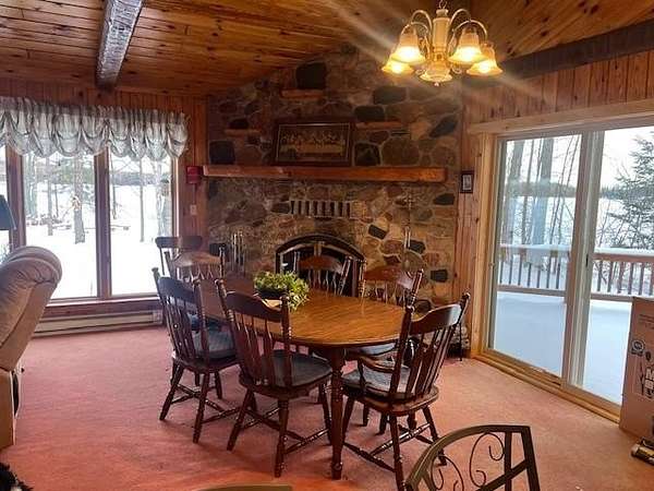 Get ready for year round fun and activities in this 25 yr old 1-1/2 story in a tranquil setting on 217 full rec lake . Two acres and 250 ft of level frontage. Extra 2 story drive-in storage building. Home consists of 2 main floor BR,s and full bath large shower stall. Open concept LR/Kitchen/dining area with majestic woodburning fieldstone Fireplace and patio doors leading to oversized walk off deck for entertaining. Open staircase leads to upper level loft with 3 beds and full bath with shower to accomodate guests. Exit door to deck and staircase. Main floor utility area. Full wall of windows in LR to enjoy the lake views. Extensive use of custom wood wainscoating and ceilings thru-out. No showings allowed until Dec 15-2025..