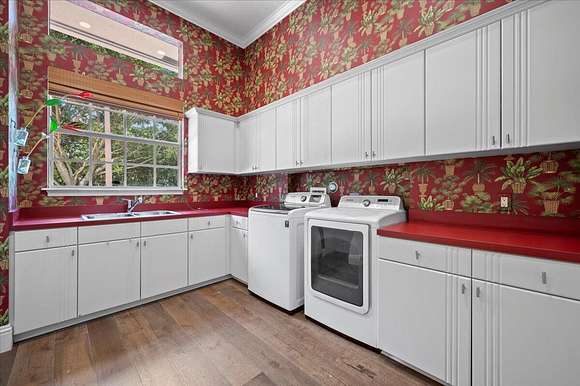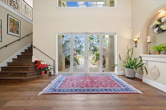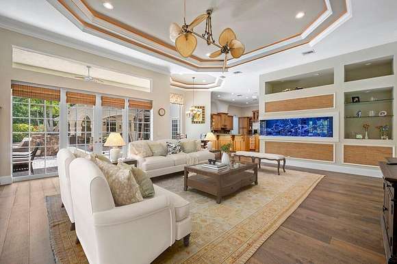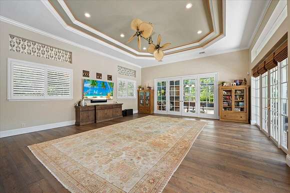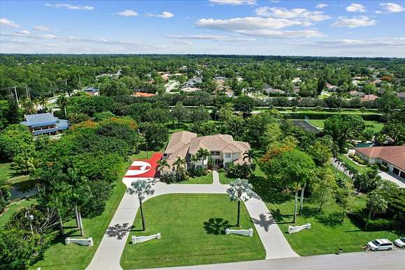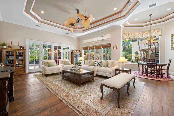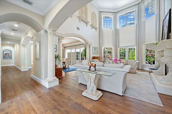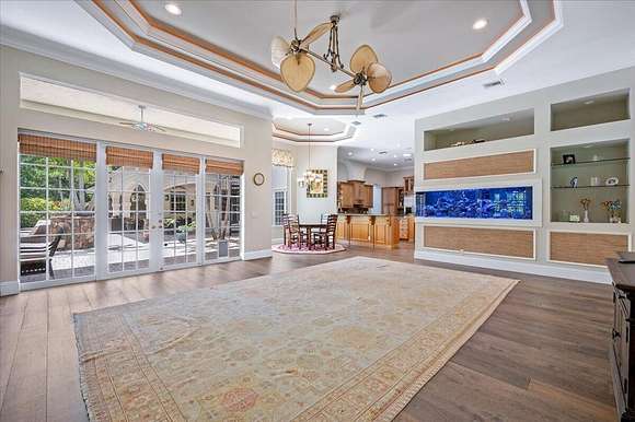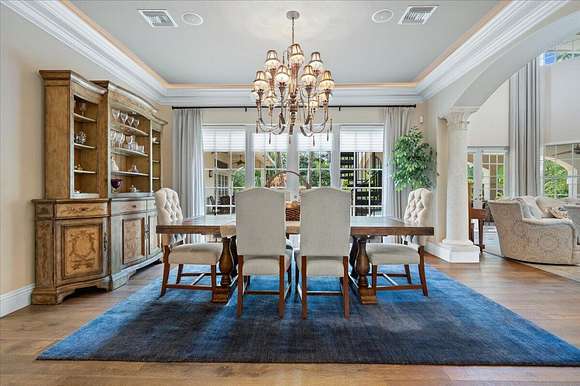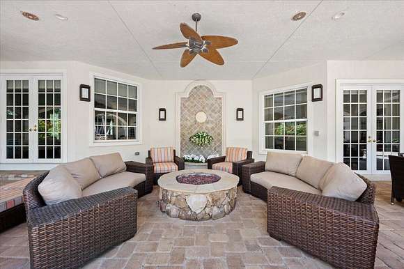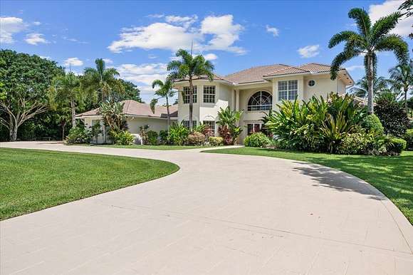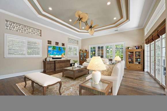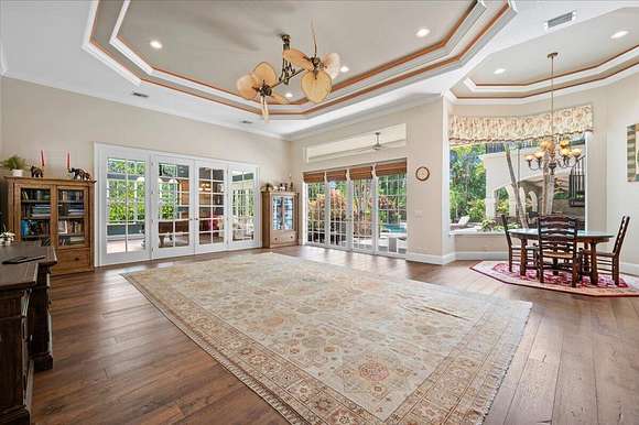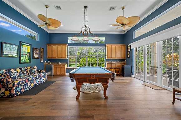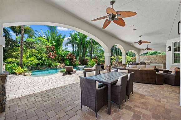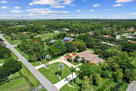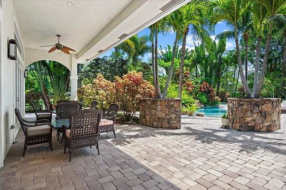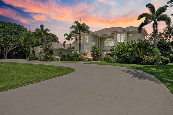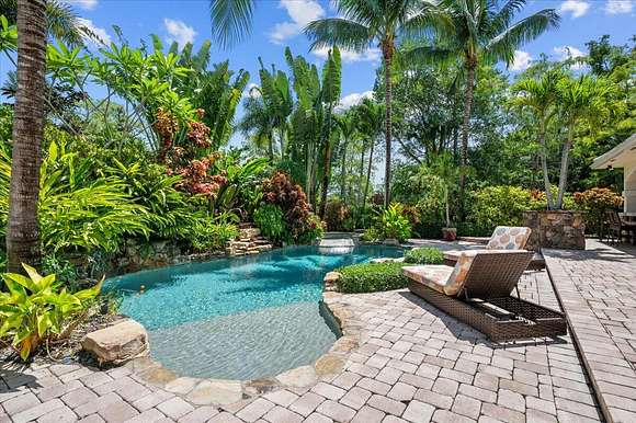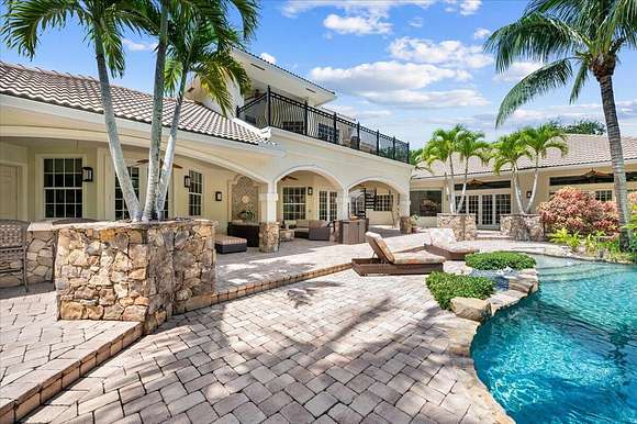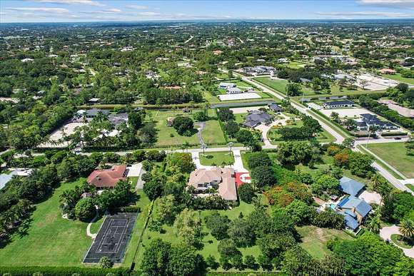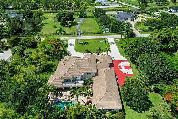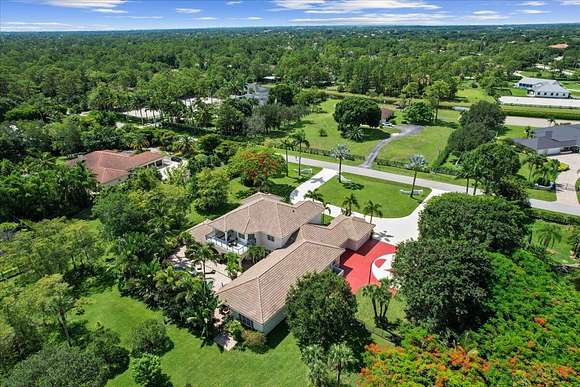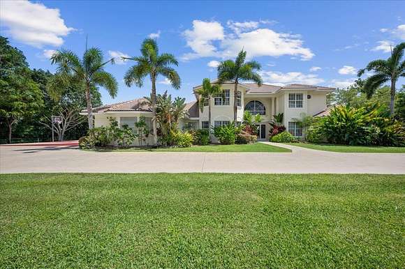 Stunning estate on 2+ acres with room to build equestrian facilities. Roof replaced August 2024. Hurricane ready with impact glass and a generator. An elegant double door entry leads you to a grand foyer with natural light streaming through the wall to wall French doors & transom windows highlighting the formal living & dining rooms. Your eye is immediately drawn to the view outside beckoning you to the lush landscaping, free form saltwater pool, fire pit and gathering areas for entertaining. Summer kitchen and bar area to the right with a cabana bath for convenience. The living room has a beautiful floor to ceiling stone wall with an electric fireplace as the focal point of this roo