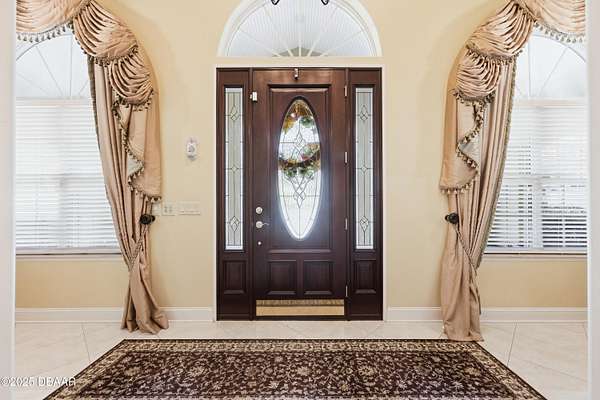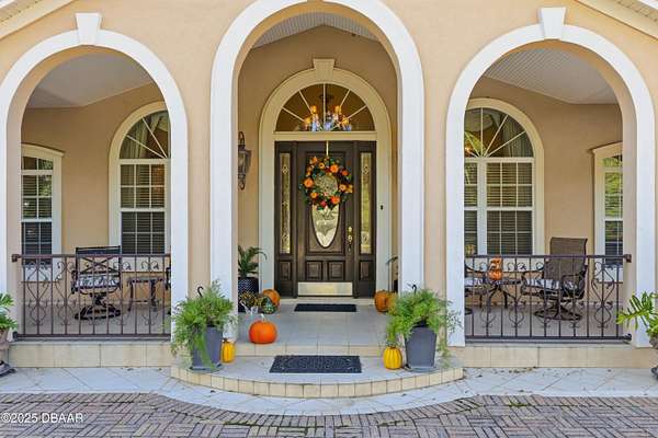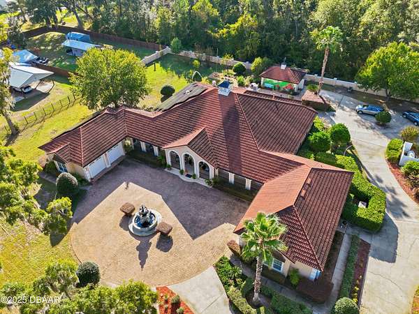 Luxurious Estate in Baker County- just 35 minutes from downtown Jacksonville. Experience timeless elegance and modern comfort in this exquisite home. Nestled on a meticulously manicured 1.85- acre lot, this custom-built home welcomes you through a private wrought- iron gate lined with a majestic oak and palm trees. Inside, a stunning rotunda foyer opens to a 76- ft. hallway adorned with gorgeous marble flooring leading to the formal dining room, a private office/library and an expansive living area featuring 12' ceilings. The gourmet kitchen is equipped with granite countertops, high-end stainless- steel appliances and an oversized walk-in pantry. Custom built-in cabinetry abuts the family room. The owner's suite offers a peaceful sitting area, dual walk-in closets and a spa-inspired bath. The main house boasts 4469 sq. ft. of living space including 3 bedrooms and 3 full baths. No expense was spared- from the custom paint finishes to the intricate trim work, every detail of this home reflects craftsmanship and sophistication. The interior is further accented with custom window treatments and draperies. Two attached garages provide over 2000 sq. ft. of parking space and storage- the north garage with a full bathroom and cabinetry, the south garage with a dedicated air-conditioned fitness room and abundant cabinet storage- easily convertible to additional living space. Step outside to the outdoor kitchen, complete with misting units overlooking the in-ground pool and 400 sq. ft. pool/utility house. The home also features three air handling systems for directed comfort. A 2024 solar panel system with a backup battery generates extensive, green energy for everyday use. Excess energy production is sold to Okefenoke Electric Company. An enhanced security system upgrade monitors the outdoor facing windows and doors. A full home automatic Carrier generator will keep everything running in case of a power outage and powered by dual 500- gallon LP above ground tanks. The center piece of the private, paver filled drive is a striking fountain and the entire property is surrounded by a concrete block privacy wall. The north grounds feature a striking ornamental waterfall. The exquisite landscaping includes a grape arbor, and pecan, peach, plum and kumquat trees. The roof is metal with a stone covering and the appearance of tiles. All information and details listed on MLS is intended to be correct, but should be verified for accuracy.