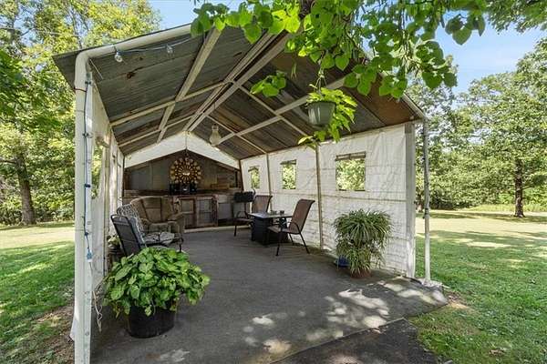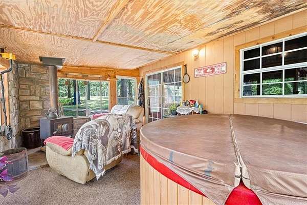 Inside, you'll find a cozy bonus room complete with a wood-burning stove and hot tub, offering a warm and relaxing space year-round. A spacious concrete floor workshop on the property provides the ideal setup for hobbies, projects, or extra storage. Quaint sun tent to enjoy outdoor mornings or evenings.
