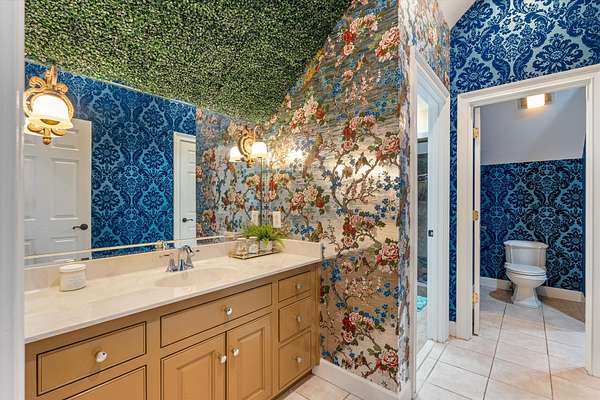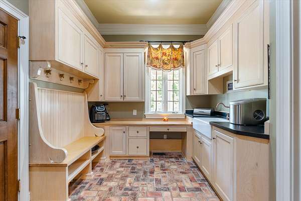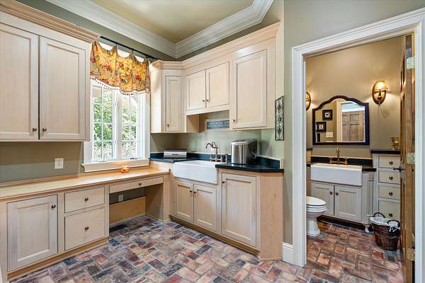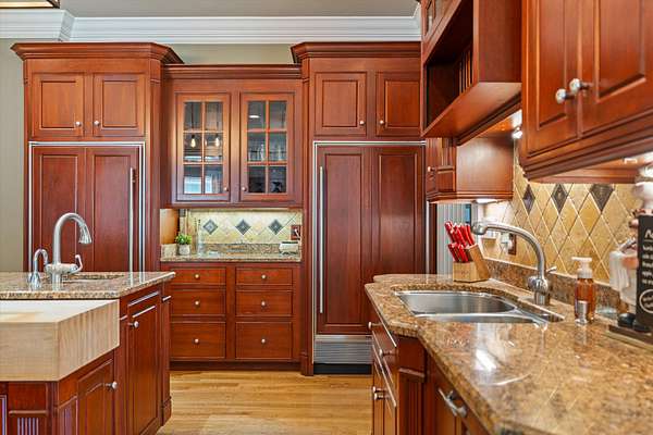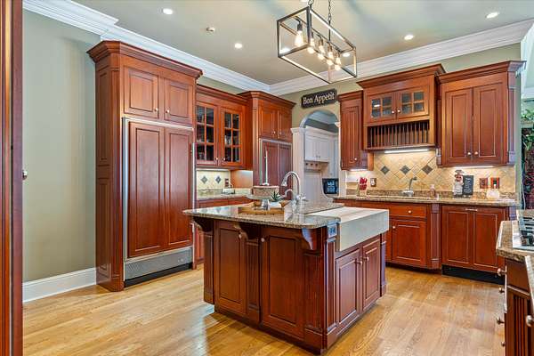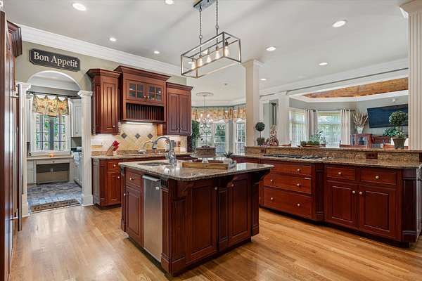 At the center of the home is a chef’s dream kitchen, equipped with premium Wolf appliances, custom cabinetry, and abundant storage—perfect for both everyday living and entertaining on a grand scale.