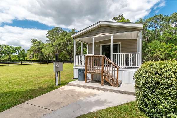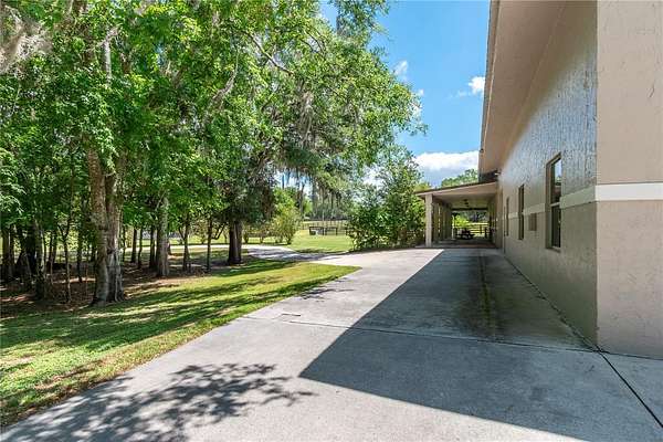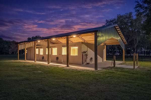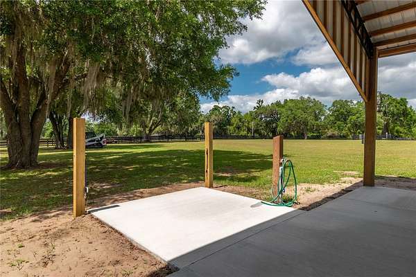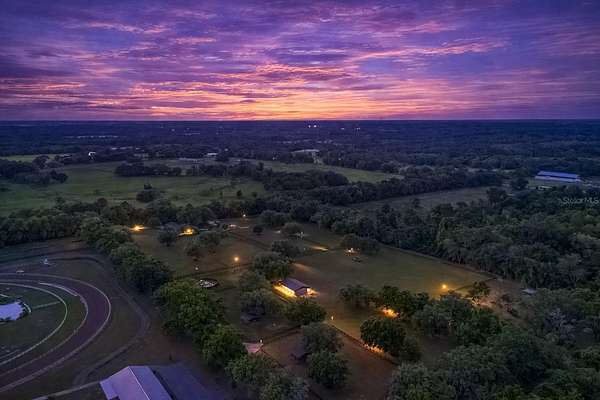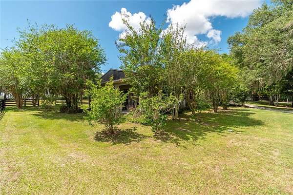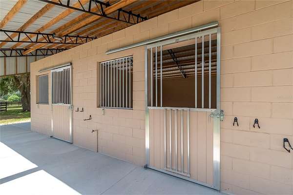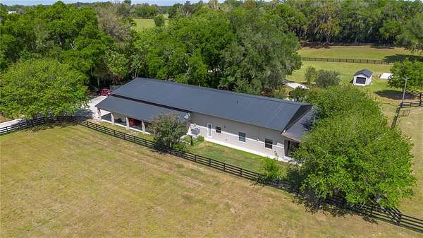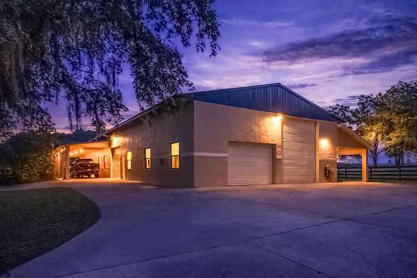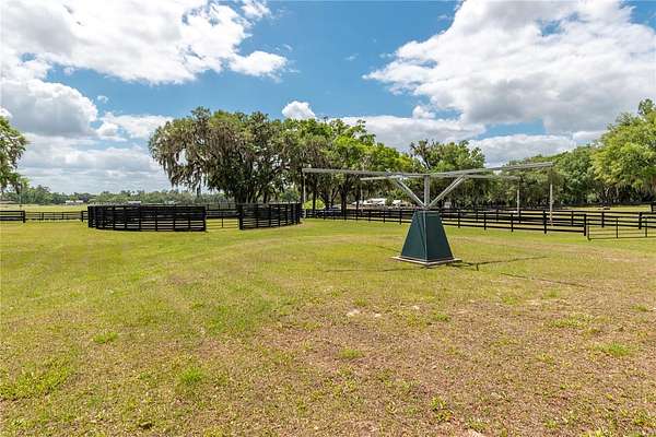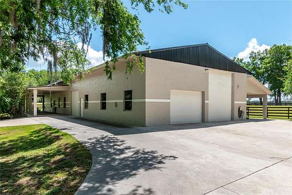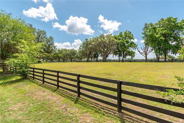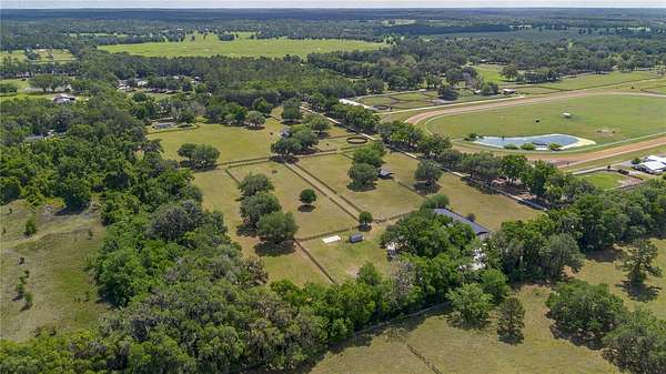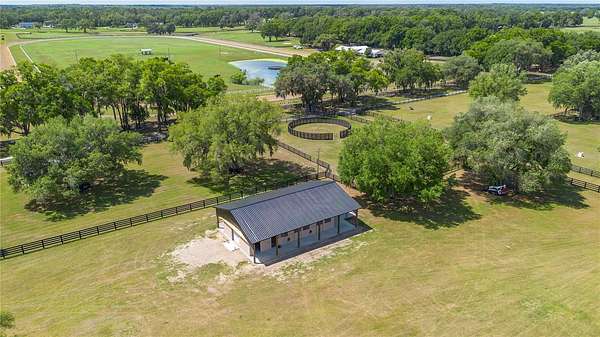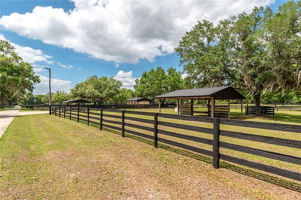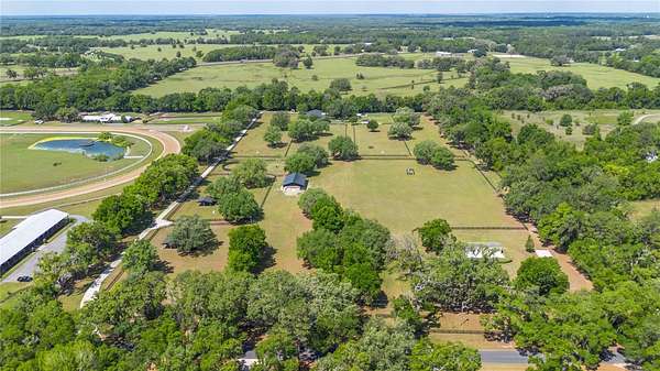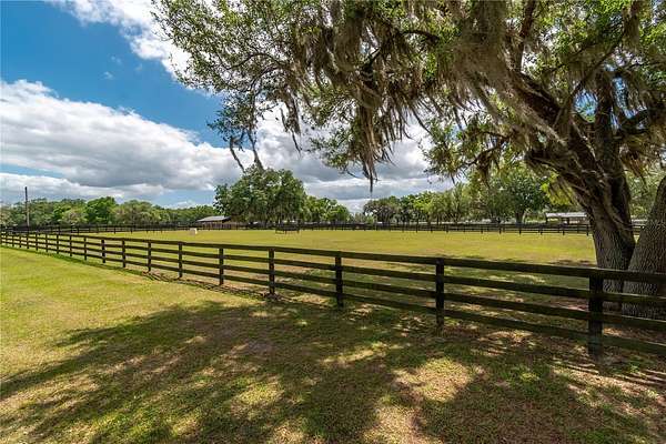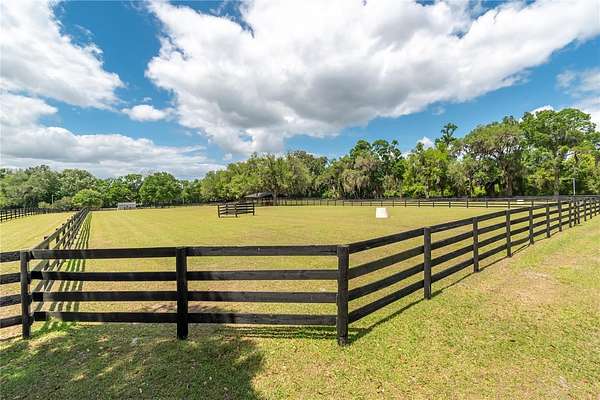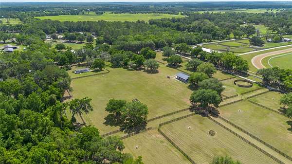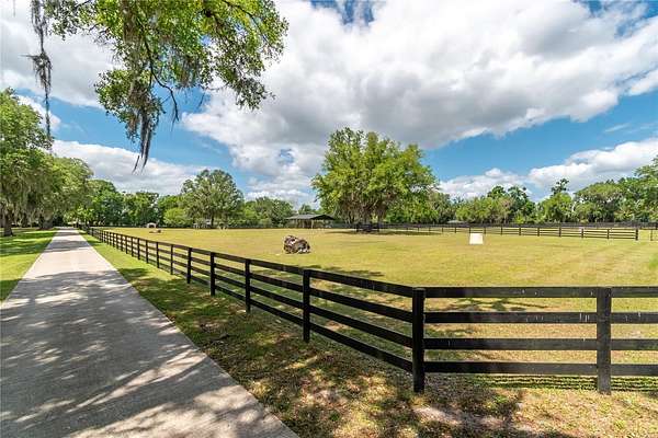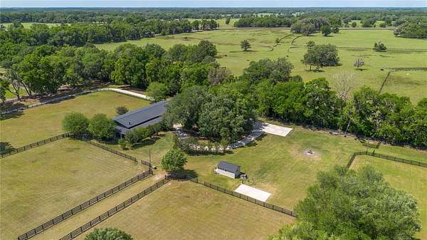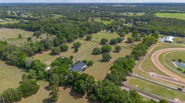Ideally placed within NW Marion County’s storied horse country, this unique 20+ acre farm is designed with both horse and rider in mind. Enter through one of three gated entrances and follow the full-length concrete drive through a park-like setting shaded by grand oaks and pecan trees. To the south of the farm you can enjoy the sight of thoroughbreds on the training track, with dressage and jumpers alike training across the street– underscoring the property’s appeal for a wide range of equestrian disciplines. The farm is well-equipped with 7 fenced and cross-fenced paddocks, automatic waterers, and run-in sheds, offering an efficient layout for daily horse care. A 6-stall concrete-block barn with feed room and tack room anchors the equestrian facilities, complemented by a round pen, hot walker, and wide riding lanes that allow for year-round training and easy access throughout the property. Additional storage buildings, irrigation systems, and established landscaping further enhance the functionality and flexibility of the farm. The main residence, built in 2005, offers over 2,000 square feet with 3 bedrooms and 2.5 baths in a split-bedroom floor plan. Inside, high ceilings, ceramic tile flooring, and a fireplace create a comfortable and inviting atmosphere. The kitchen is designed for both everyday living and entertaining, featuring abundant cabinetry, granite countertops, an island workspace, and an adjacent dining area. French doors and multiple living spaces open to expansive covered porches, providing seamless indoor-outdoor living and sweeping views of the surrounding pastures. Directly attached to the residence is a comprehensive RV-ready garage with high ceilings and oversized doors, as well as a separate 4-car garage with integrated workshop space that is ideal for large vehicles, equipment, or hobby use. A well-maintained secondary 1-bedroom, 1-bathroom guest cottage is also established on the property, offering flexible accommodations for guests, staff, or even potential seasonal rental income. Conveniently located just minutes from Williston and within easy reach of Ocala’s extensive tack and feed options, equine service providers, and world-class veterinary care. HITS is located just 6 miles away, while the World Equestrian Center (WEC) is a scenic 25 minute drive from the farm. This property offers a rare combination of functionality, space, and natural beauty– well-suited for equestrian pursuits or a private country retreat!