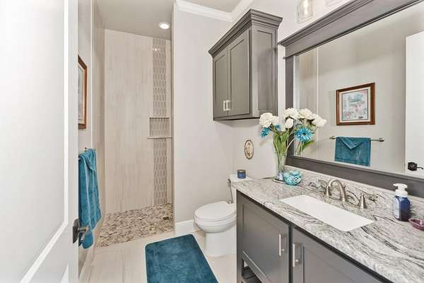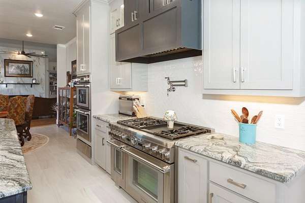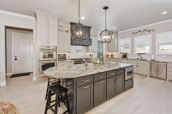 - Chandelier, Decorative Lighting, Eat-In Kitchen, Granite Counters, In-Law Suite Floorplan, Kitchen Island, Open Floorplan, Pantry, Vaulted Ceiling(s), Wet Bar