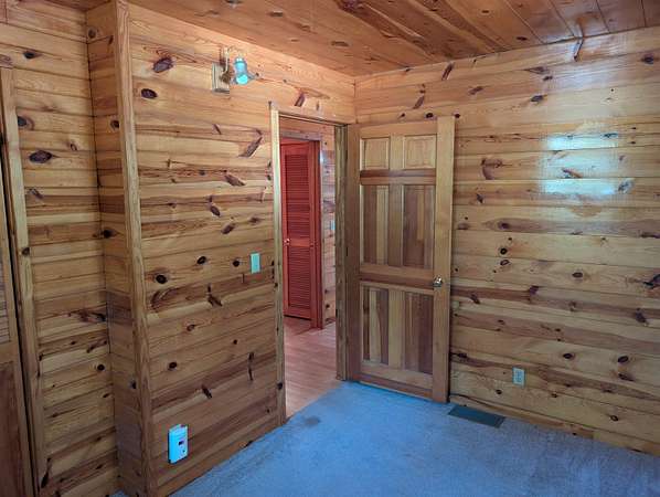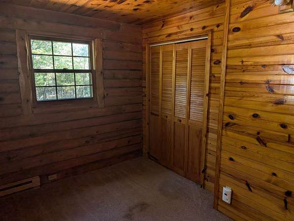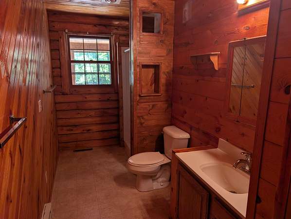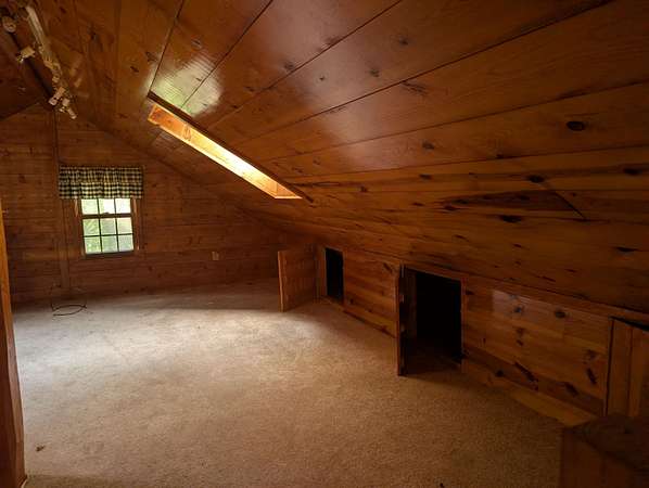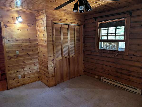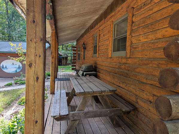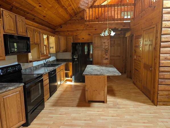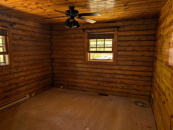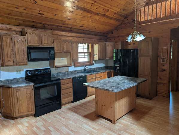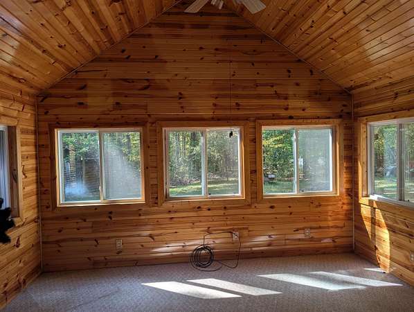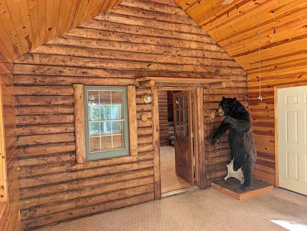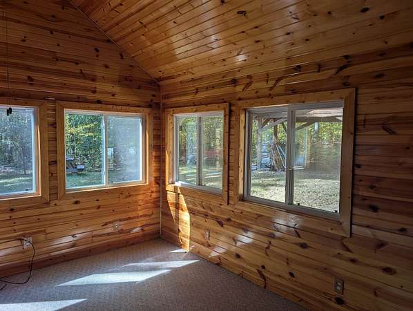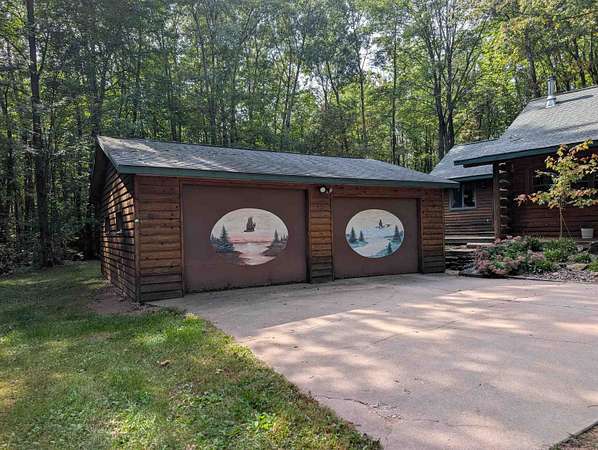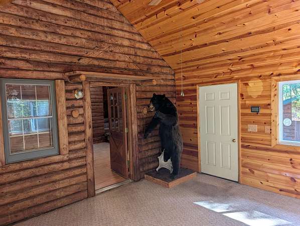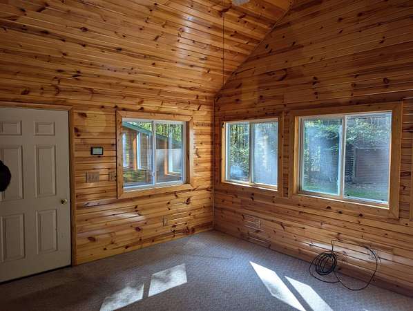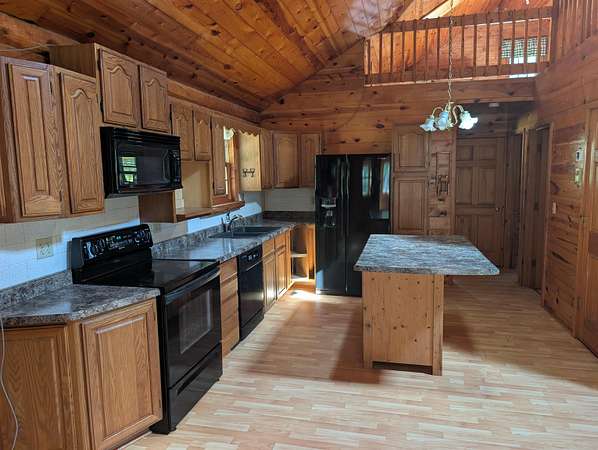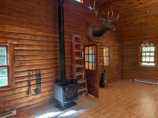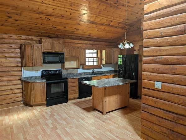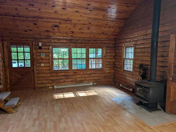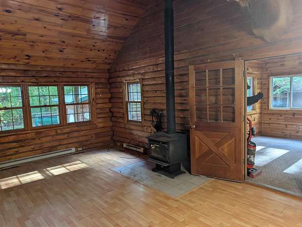 Est $1,601/moBeutiful full log cabin on a private wooded 5 acre setting. Home includes 2 main floor bedrooms and a full bath along with an upper loft perfect for a bunk room or office area. Open concept main level featuring a great room accented by vaulted ceilings and a wood burning stove, a large dining area and kitchen with an island. There is also a beatiful wood paneled sun room. You will feel like you are somewhere far away in the woods even though you are 5 minutes to town. There is a two car garage, fire pit area, storage shed and wood storage shed.