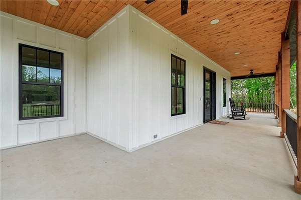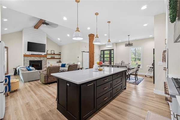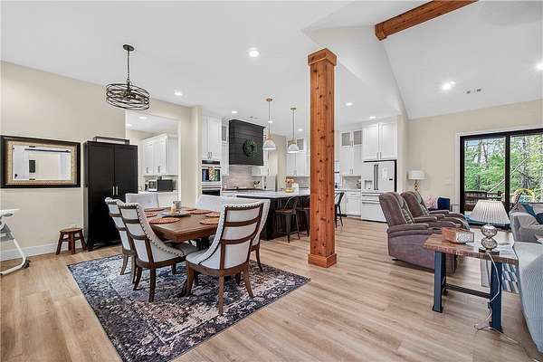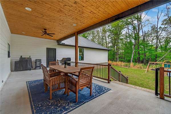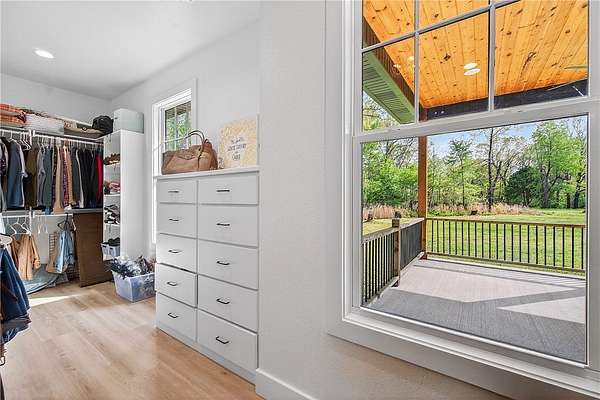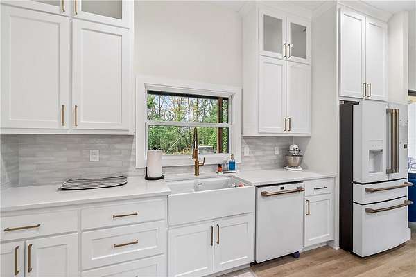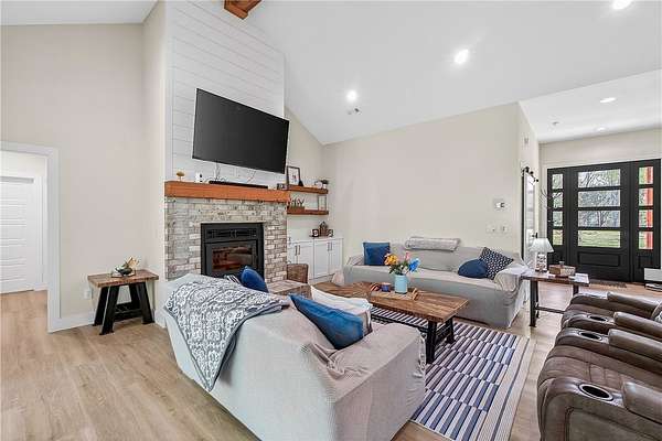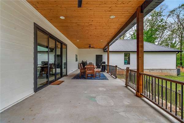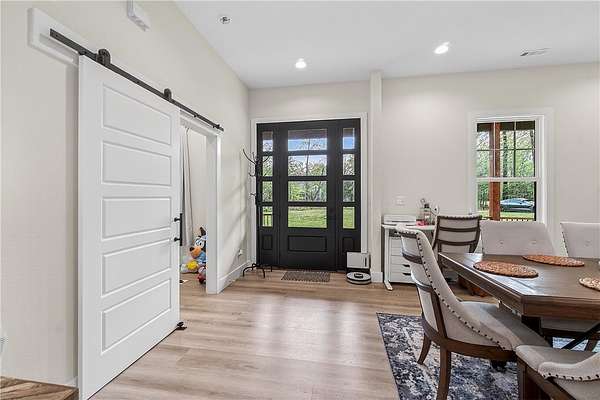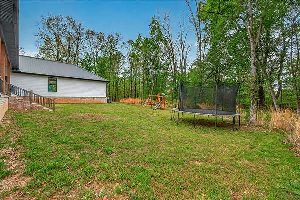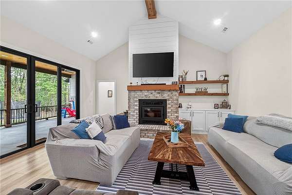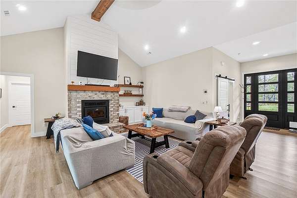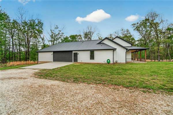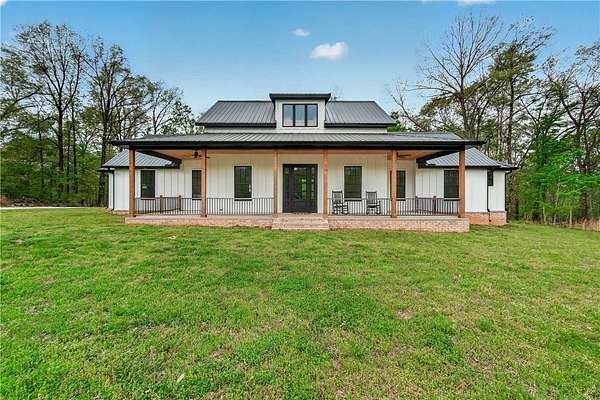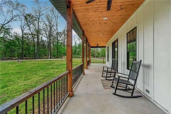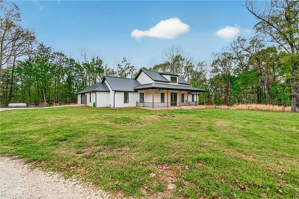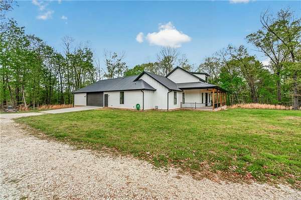 Like-new farmhouse-style home on 5 acres near Lake Wedington, where peaceful living meets everyday convenience just minutes from town. Step inside to an open, light-filled layout centered around a stunning chef's kitchen featuring double ovens, a 9-foot island, quartz countertops, commercial-grade gas cooktop, farmhouse sink, Cafe appliances, and a butler's pantry. The oversized primary suite offers a quiet retreat with a built-in window bench framed by four large windows overlooking the backyard. The en-suite bath includes dual vanities, a dedicated makeup area, and a spacious walk-in closet with built-in dressers. A standout feature is the finished bonus room off the garage, complete with a mini split, perfect for a movie room, game room, home office, or private guest space. Additional highlights include a dog wash station in the laundry room, energy-efficient foam insulation, instant hot water, two furnaces, and LVP flooring throughout and carpet in the jack-n-jill bedrooms.
