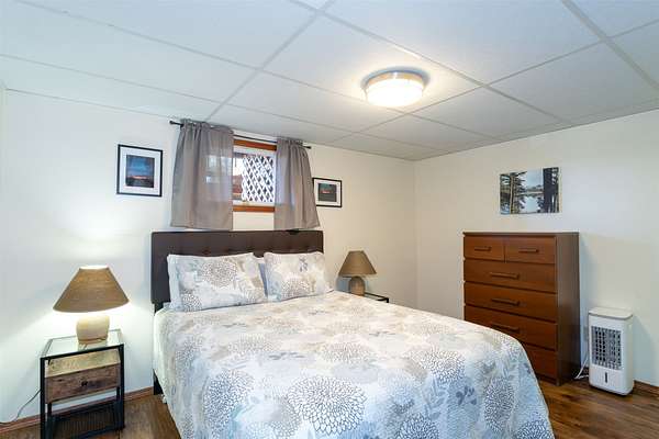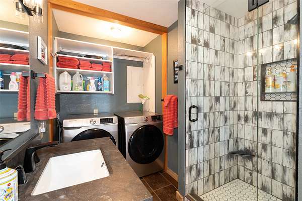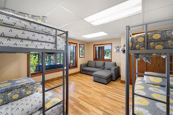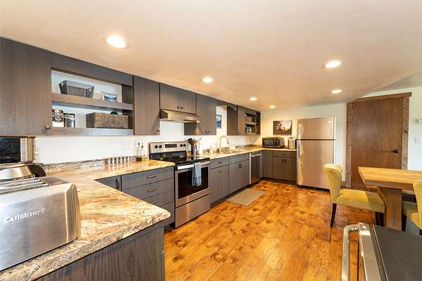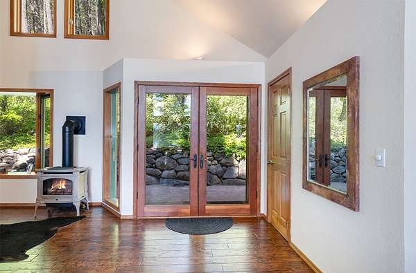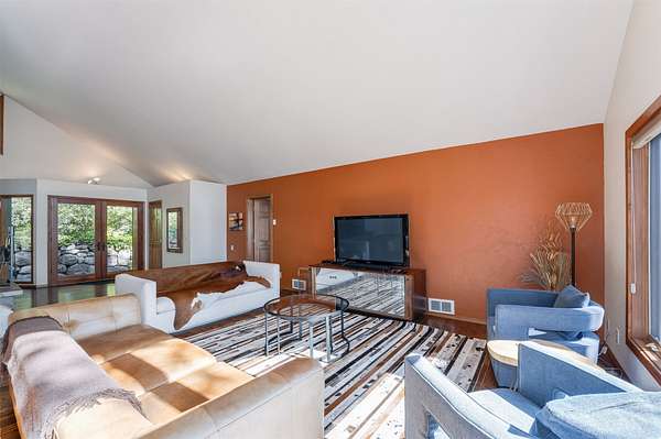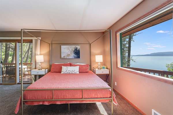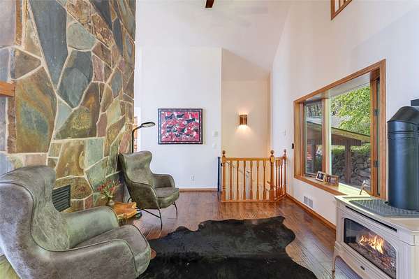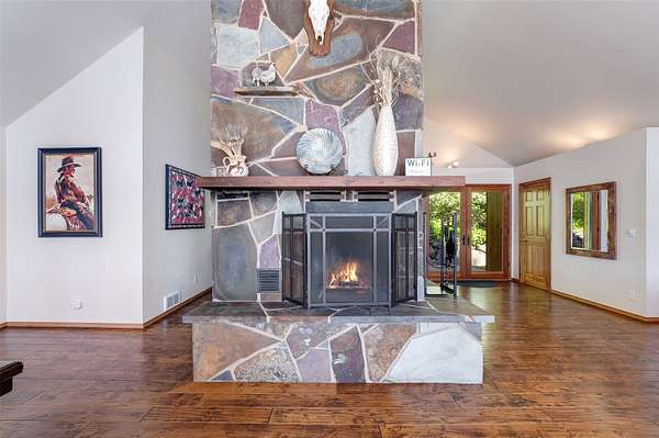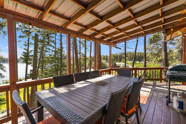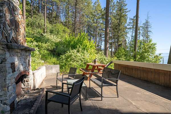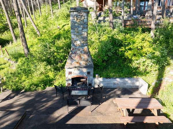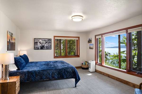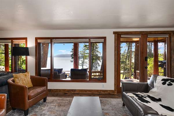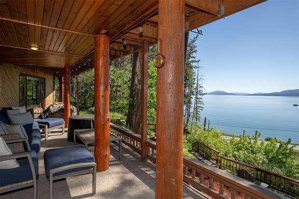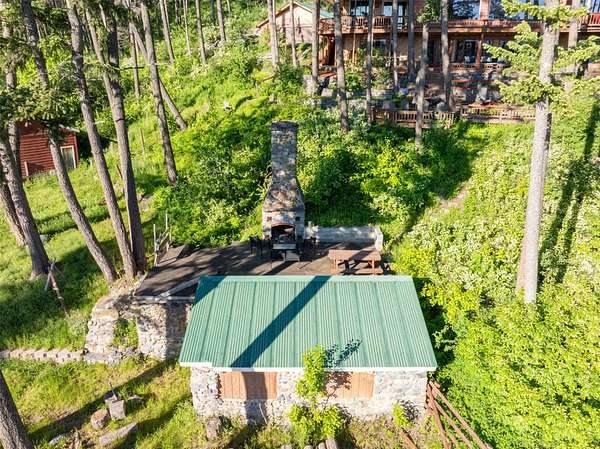 Expansive 5-bed, 4-bath, 3976 SF rustic modern Montana home on 14 acres with 124' of Flathead Lake frontage, perfect for your Montana dreams of lake and land recreation ... swim, hike, fish, or ride horses from your property up into the public lands beyond from this unique and very rare property, you can do it all! The main upper level features a primary suite, chef's kitchen, great room, guest bedroom, and expansive decks with stunning lake views and sunsets. The lower level shares the spectacular views and offers separate living quarters with a private entrance and patio, primary suite, two additional bedrooms, kitchen, and laundry, and is also accessible via the circular staircase from above. Bordering State Lands with National Forest beyond, you will enjoy trails to lakes, fishing, and huckleberries. Located south of Bigfork in vibrant Woods Bay, you're just steps from restaurants and live music entertainment. Proven rental income from both levels. A county permit may be required. The property spans two parcels with diverse landscapes. The upper parcel's flat to rolling benches, were previously used for horse grazing, and includes an incomplete foundation from a prior owner's project, offering potential for gardening, horses, or other projects with lake views, very usable topography and unique rock outcroppings. The lower parcel features a versatile barn/shop and a historic stone fireplace from the old stone homestead, now a charming outdoor fire gathering place. Bordered by State Lands with National Forest beyond, the estate provides unparalleled access to outdoor recreation, including hiking, fishing, and lake activities. The home's design blends rustic elegance with modern amenities, showcasing high-end finishes and panoramic Flathead Lake vistas. Ideal for multi-generational living or investment, the two separate level's quarters have a strong rental history. Woods Bay's lively scene, with dining and entertainment nearby, enhances this rare lakefront retreat's appeal. Build the dock of your dreams to further enhance your enjoyment of the magnificent Flathead Lake! Note there is a wood fireplace on the main level in the great room, a gas stove in the entry, and a gas fireplace in the primary suite on the main level. There's also a gas fireplace in the great room on the lower level. There is a barn below the house and an old foundation above the home on the upper parcel. There is no zoning on the property and there are no covenants on the majority of the acreage with only light covenants on a small portion of the upper acreage. Note that the cadastral map does not reflect the boundary line adjustments made in 2020. See the Amended Plat in Documents. Conveniently located 5 miles from Bigfork on paved county roads, you may enjoy a multitude of recreational, dining, and entertainment options just steps away, and there's nearby access to two public boat launches and recreation areas just 2-3 miles away. Plus, you're only an hour from Glacier National Park and within minutes of all the Flathead Valley's incredible amenities. The charming village of Bigfork (pop. 4000+) is just minutes away, and it is home to superlative art galleries, fabulous dining possibilities, quaint shops, and the Bigfork Summer Playhouse, which has been celebrated as one of the Northwest's finest repertory theaters for over 50 years. All this is delightfully accompanied by the warmth and hospitality for which Montanans are known. Among other accolades, Bigfork has been voted as "One of the 50 Great Towns of the West" and designated as "One of the 100 Best Small Art Towns of the Nation" which is no surprise given its thirteen world class art galleries. Bigfork has been named as one of the 100 Best Getaways for a Vacation or a Lifetime and in "The 10 Most Beautiful Places To Go For A Run" by Nike. "Quiet, isolated, and peaceful, the trails at Bigfork are among the best in Montana, which itself offers hundreds of opportunities for stunning running paths."