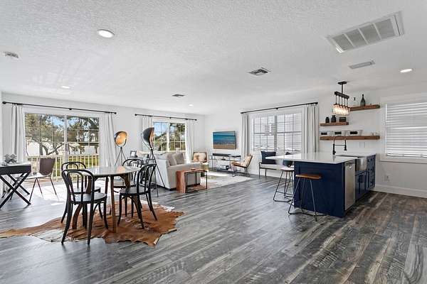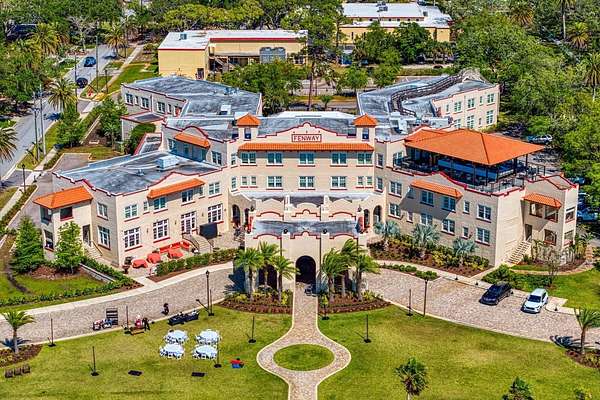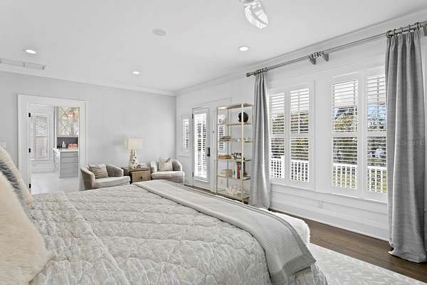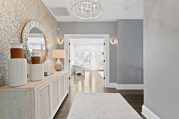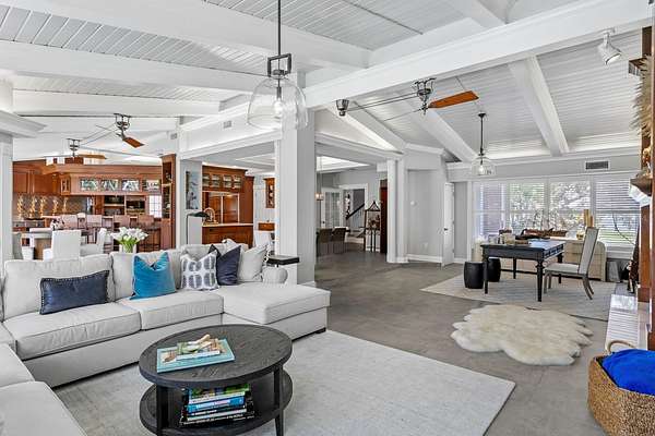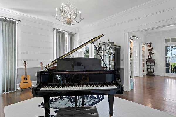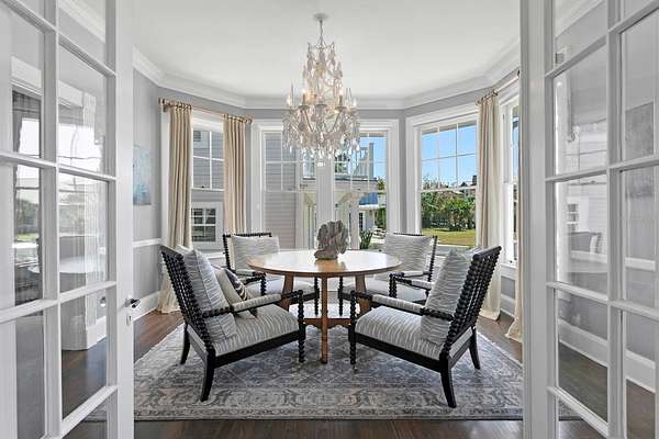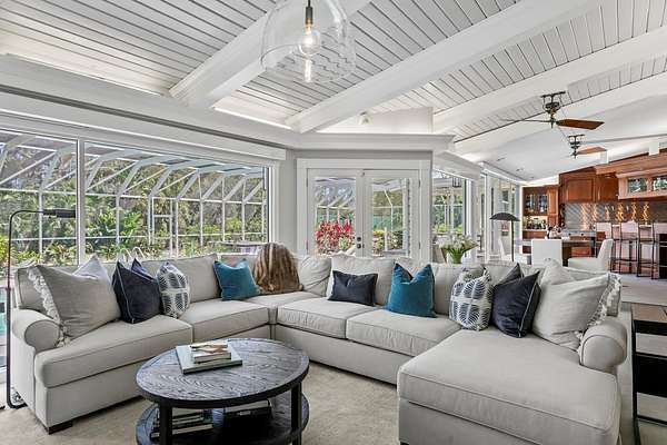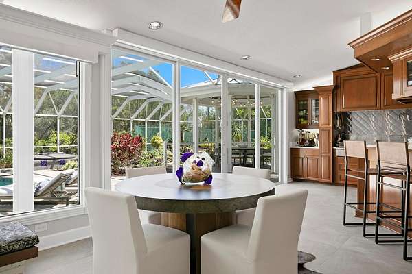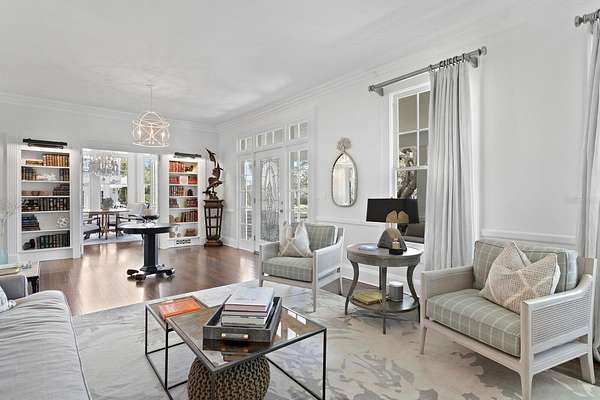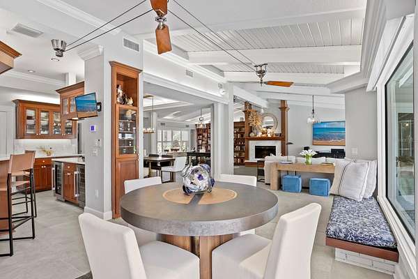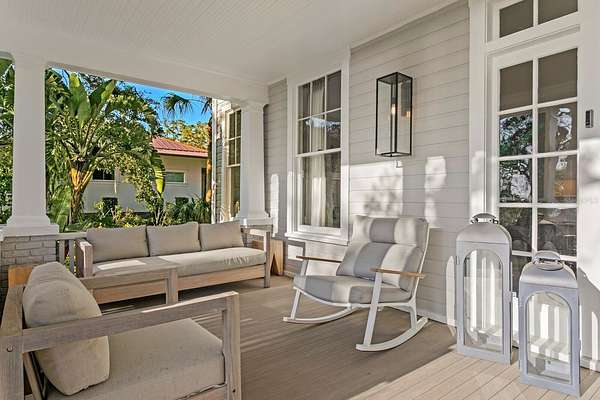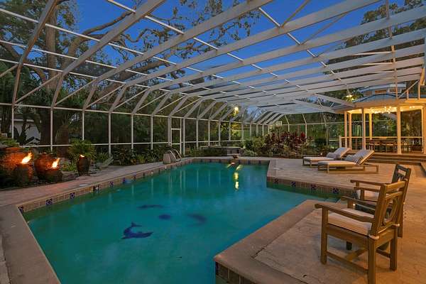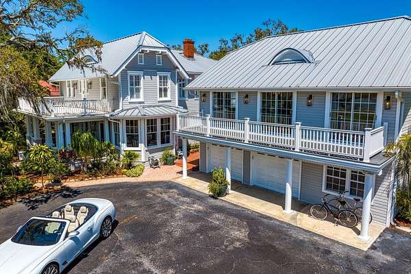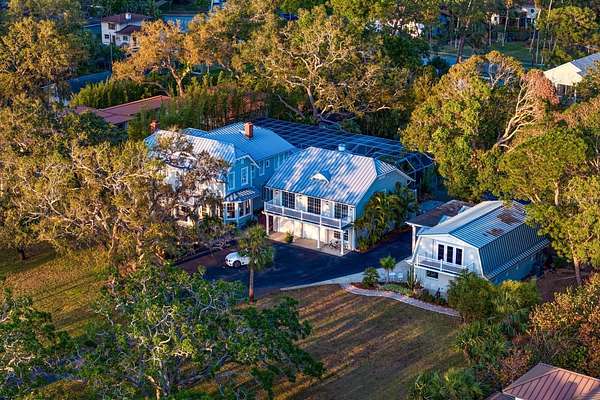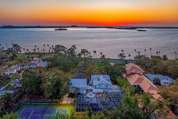 A rare opportunity awaits on the prestigious Edgewater coastline--4.9 acres of elevated coastal elegance spanning two expansive lots with over 226 feet of prime water frontage. This estate is the embodiment of timeless sophistication and enduring craftsmanship, seamlessly blending classic architecture with thoughtful, modern refinement. With a proven history of resilience--remaining untouched by the 2024 storms--it offers peace of mind and enduring value. Each parcel allows for Intracoastal Waterway access, with the option to add a private dock, further enhancing the estate's waterfront appeal. From the moment of arrival, grandeur and serenity abound. A newly constructed TEK composite porch leads into a residence rich with character--restored original hardwoods, custom millwork, and layered textures create a setting that is both stately and warmly inviting. Multiple living spaces, each imbued with their own ambiance, include a formal music room and a sitting room--both anchored by wood-burning fireplaces--a wraparound-windowed dining room, and a cozy family den complete with custom built-ins and a rolling library ladder. At the heart of the home, the chef's kitchen is a culinary showcase: six-burner Thermador range, dual Sub-Zero refrigeration, wine fridges, a warming drawer, and a large central island adorned with Swarovski crystal hardware. Underfoot, linen tile floors lead through to a light-filled family room where sliding glass doors open to panoramic water views, creating a seamless transition to the outdoor oasis. Whether hosting grand soirees or enjoying quiet mornings, the home's built-in bar, casual dining nook, and expansive entertaining areas are thoughtfully designed to elevate every moment. Upstairs, a loft-style corridor with tobacco-printed wallpaper guides you to the guest bedrooms--each spacious and unique--a cork-accented bath, and an elevator that serves all floors for ultimate convenience. The west-facing primary suite is a private sanctuary, complete with fireplace, private sunset balcony, and a spa-caliber ensuite featuring a marble walk-in shower, soaker tub, crystal-inlaid mosaic tiling, and a bespoke dressing room with center island storage. Beyond the main home lies a gracious guest house--with three bedrooms, balconies, a prep kitchen, and its own Generac generator--perfectly suited for visitors or extended stays. A Game Room House offers endless entertainment with a full bar, bath, and ample room for games, while a custom office with floor-to-ceiling cabinetry and balcony provides a serene space for productivity. Outdoors, the estate transforms into a private coastal retreat: a lighted tennis court, koi pond with cascading waterfall, gazebo for al fresco dining, and a resort-style swimming pool with diving board all set within lushly landscaped grounds and gas lantern-lit ambiance. A fully outfitted garage with new laundry, full bath, gym area, and abundant storage completes the offering. With restored windows, natural gas service, and curated luxury finishes throughout, this home is not just a residence--it's a legacy. With its elevation, privacy, iconic location, and unyielding beauty, it offers a once-in-a-generation opportunity to own a piece of the coast that's truly irreplaceable. Come see this unique property blocks from the Historic Fenway and 1 mile to downtown Dunedin.