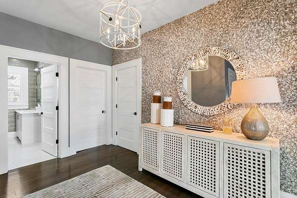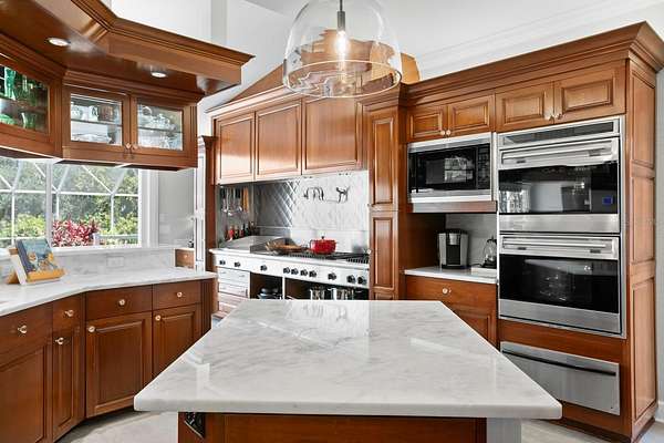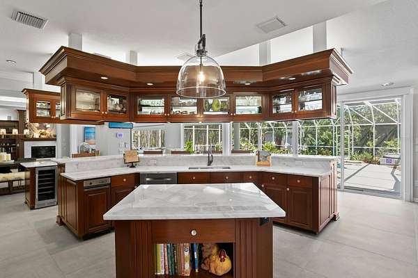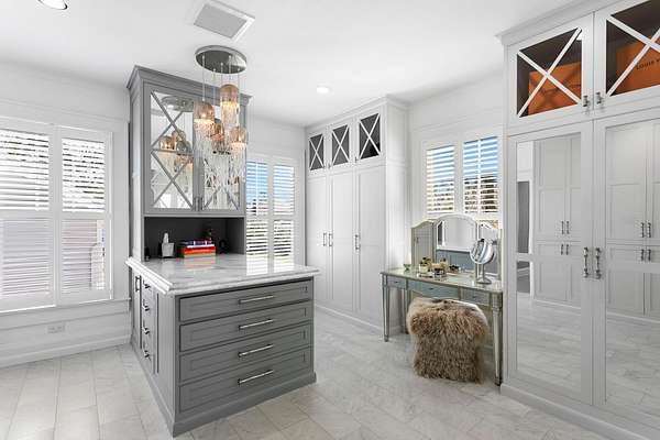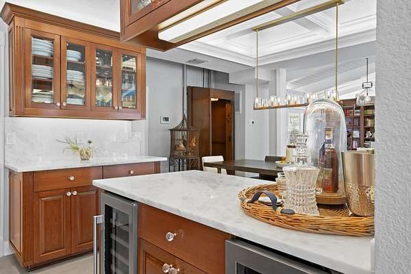 - Built-In Features, Ceiling Fans(s), Coffered Ceiling(s), Crown Molding, Dry Bar, Elevator, Kitchen/Family Room Combo, Open Floorplan, Primary Bedroom Upstairs, Solid Surface Counters, Solid Wood Cabinets, Split Bedroom, Stone Counters, Thermostat, Tray Ceiling(s), Walk-In Closet(s), Window Treatments