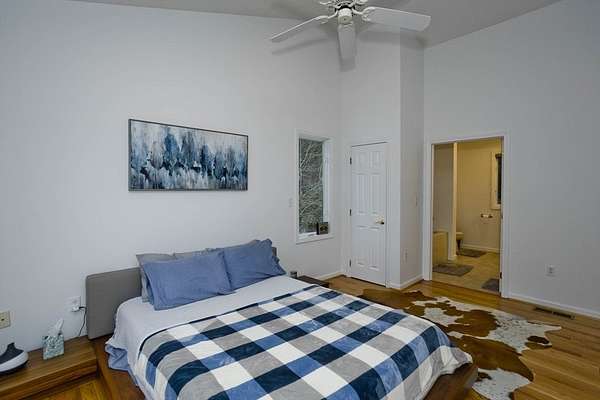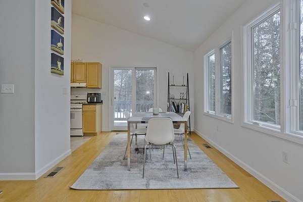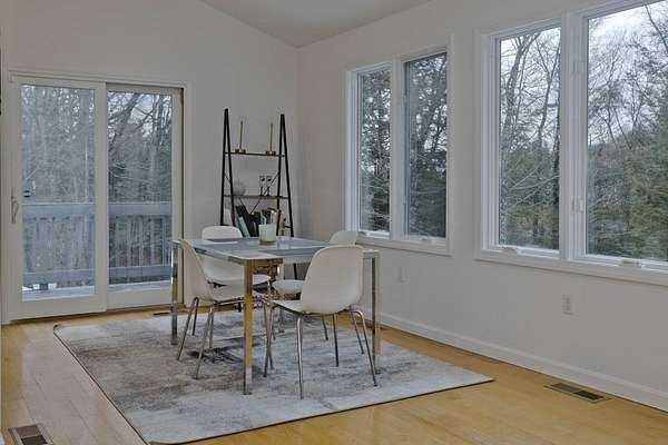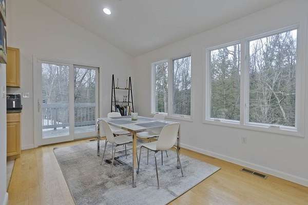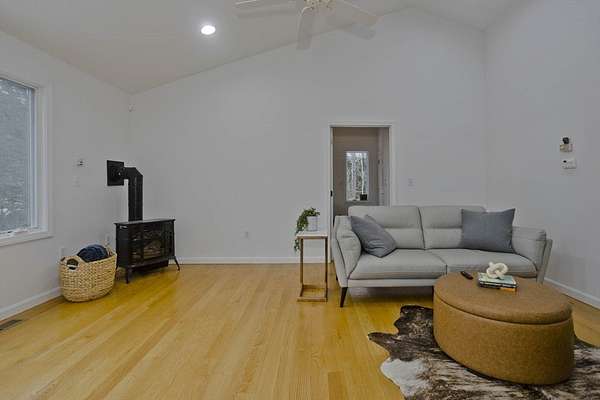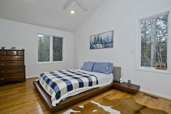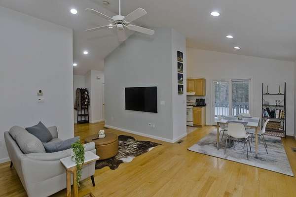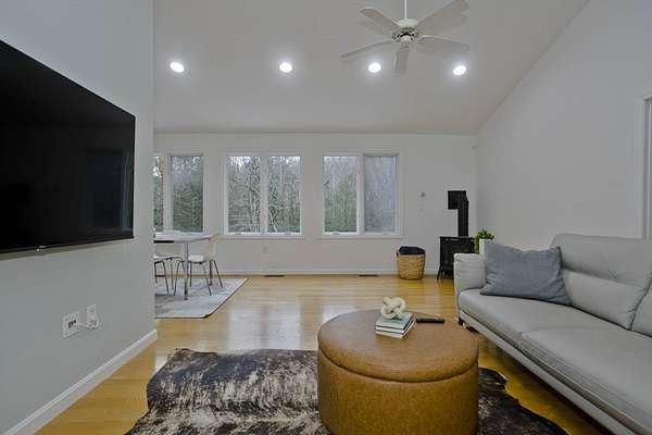 Welcome home to this 3 bed, 2.5 bath contemporary offering an open floor plan, main-level primary suite, & a private trail leading to the wild streambed of Glendale Brook! Enter through the welcoming foyer to the main level that features a spacious living room & dining area w/ propane stove & sliders to a sunny deck, a kitchen with pantry closet, half bath with laundry, a first-floor office, & a primary bedroom with ensuite bath featuring a jetted tub and 4' shower. The lower level provides flexible living with a second office, bonus room, 2 bedrooms with forest-facing windows, a shared recreation area, kitchenette, full bath and a built-in sauna! An exterior door opens to the private trail along Glendale Brook, leading to a natural dipping pool. Additional features include an oversized two-car garage, a whole-house humidifier, propane space heater in the basement, a newly replaced furnace, inverter for solar system, and ChargePoint EV charger. Don't wait- schedule your showing today!