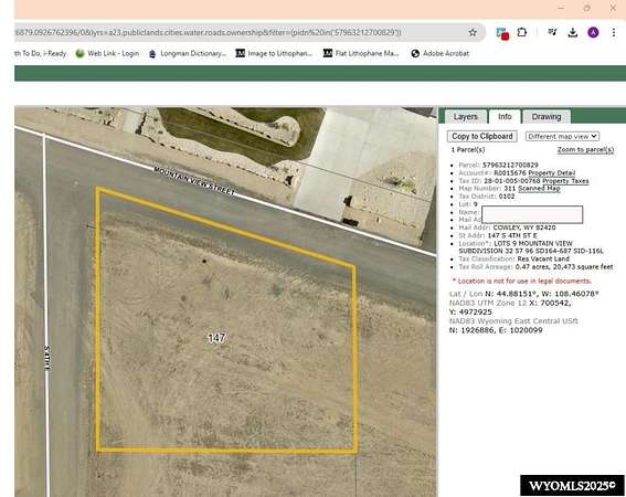 Est $511/moFantastic opportunity to purchase a city lot in the Town of Cowley! This .47 acre (20473 sq. ft) corner lot is in a premium subdivision with mountain views. Lot includes City water, sewer, natural gas, and fiber optic internet to the property line. There are basic subdivision covenants to protect you and your investment, BUT NO HOA fees. Keep the small town feel but only 23 mi. to Powell, 47 mi. to Cody, 65 miles to Red Lodge and 71 mi. to Laurel MT. Street address:LOT 9 or 147 S 4th St E, Cowley, WY 82420